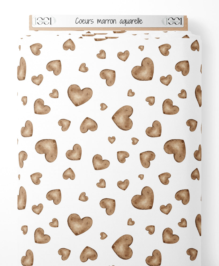 Les cœurs sont de couleur marron avec un effet aquarelle. Ils sont répartis de manière aléatoire sur le fond blanc.Les tissus