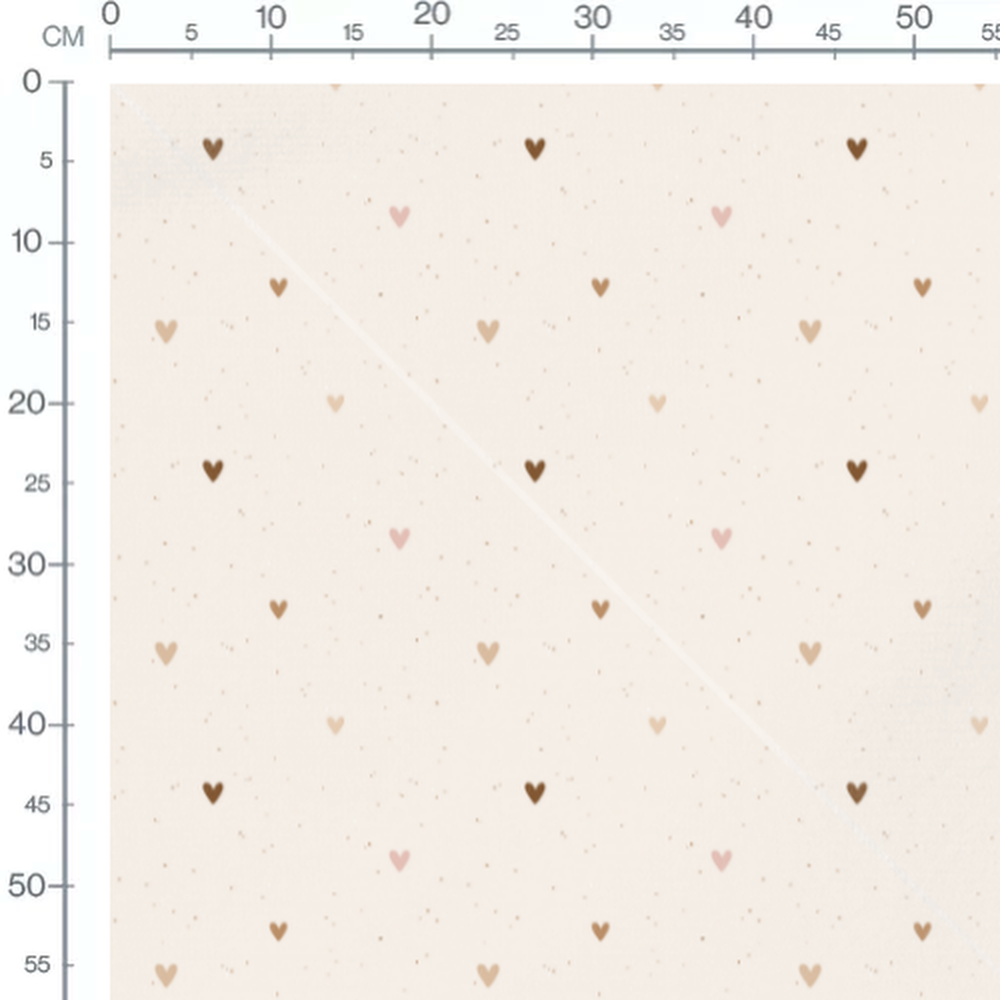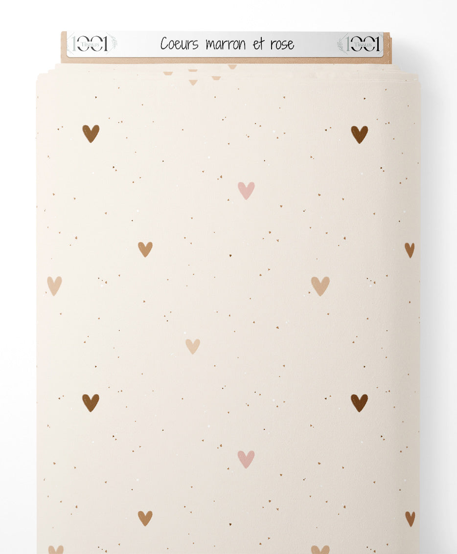 Les cœurs sont de différentes tailles et teintes de marron et rose. Le fond beige est parsemé de petits points noirs. Les motifs sont espacés de manière aléatoire.Les tissus