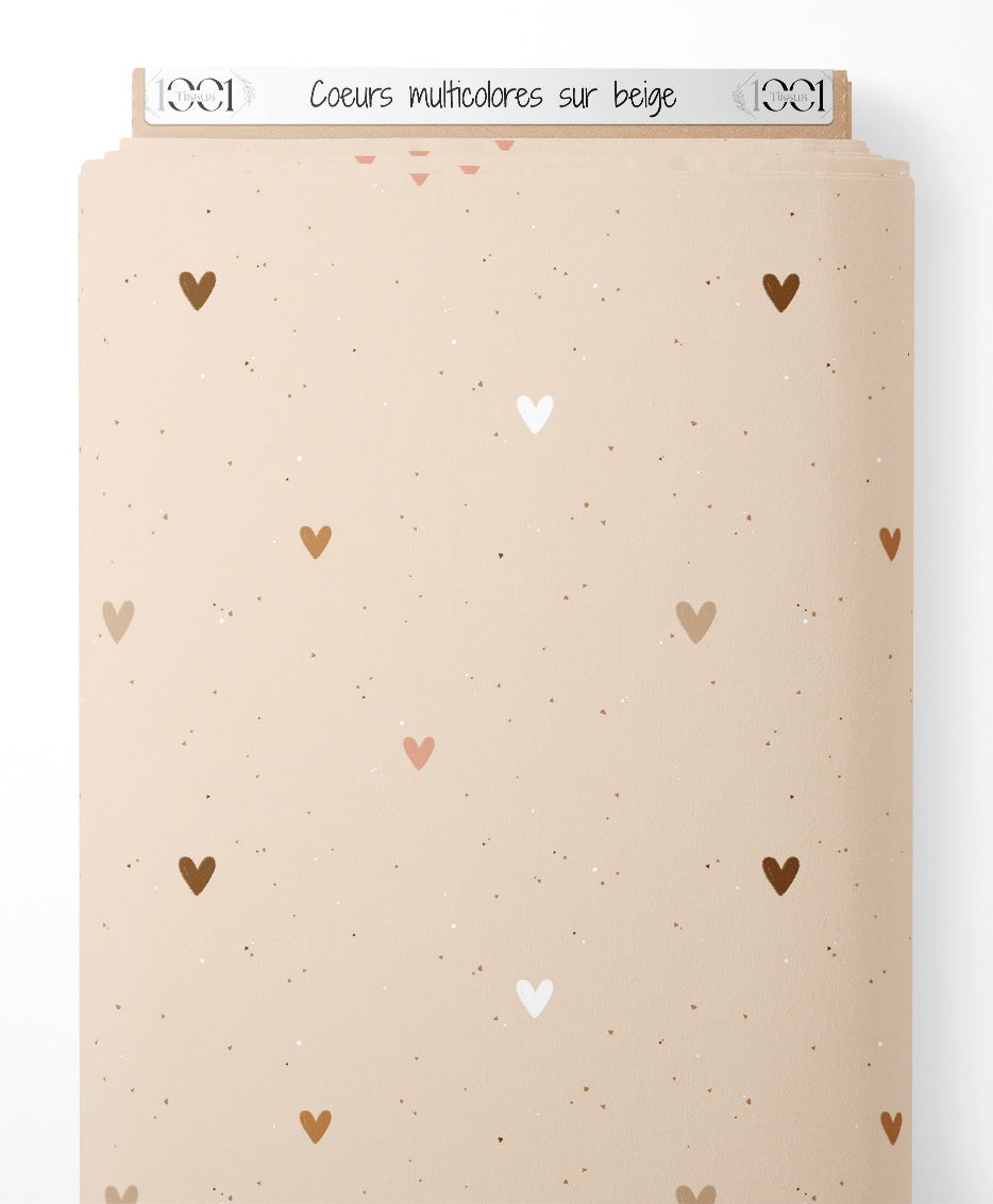 Tissu - Cœurs multicolores sur beige