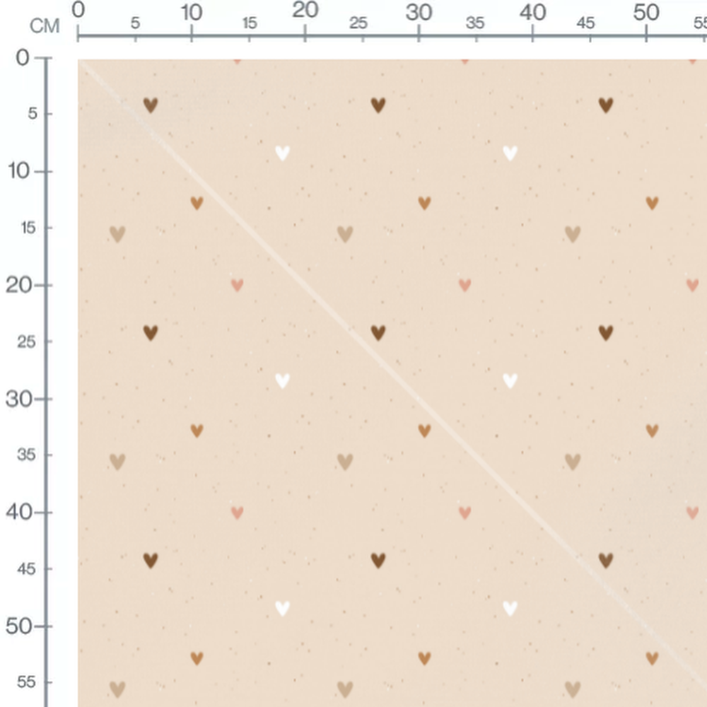 Les cœurs sont de différentes tailles et teintes. Le fond beige est parsemé de petites taches noires. Les cœurs ajoutent une touche de douceur au motif.Les tissus