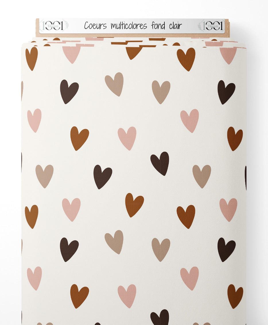 Les cœurs sont disposés de manière aléatoire. Les couleurs varient entre marron foncé, beige et rose pâle. Le fond blanc cassé met en valeur les couleurs des cœurs.Les tissus