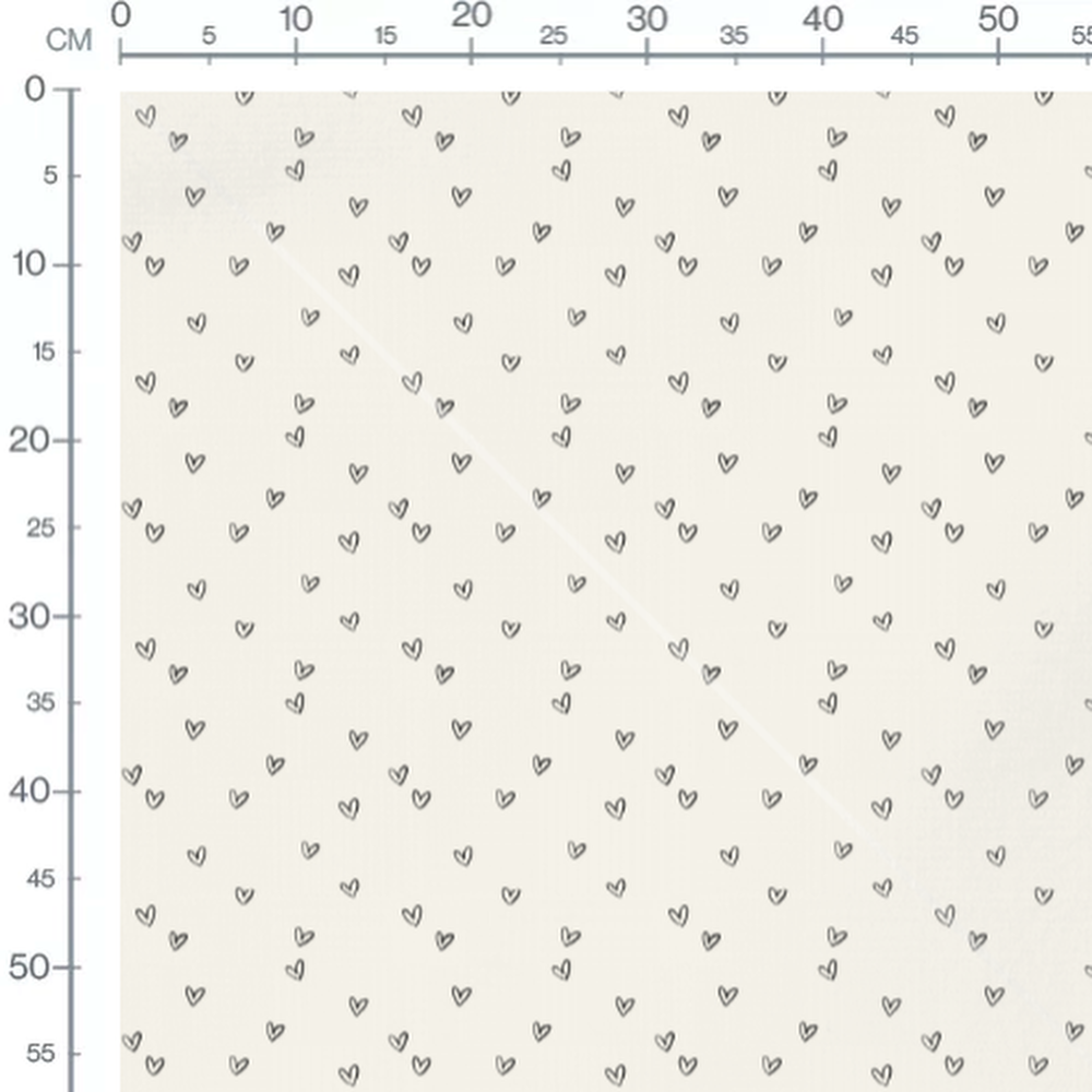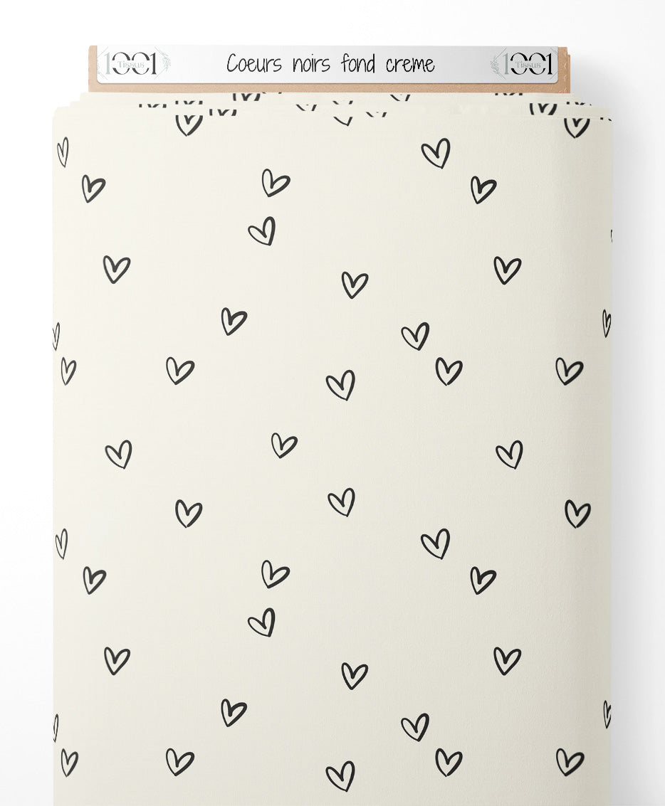 Les cœurs sont de taille uniforme et dispersés aléatoirement. Le fond crème met en valeur les cœurs noirs. Le style dessiné à la main ajoute une touche artistique.Les tissus