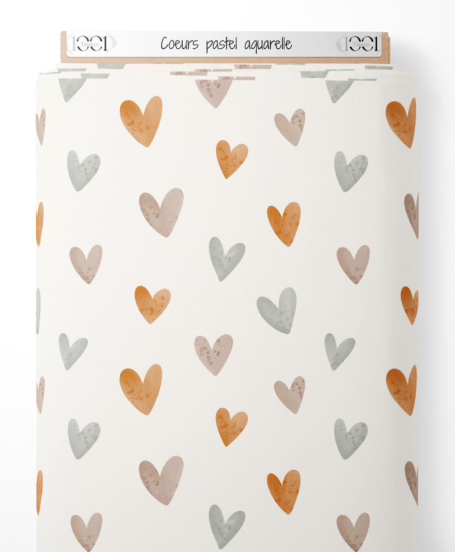 Les cœurs sont peints dans des tons doux et variés. Le style aquarelle ajoute une texture délicate au motif.Les tissus