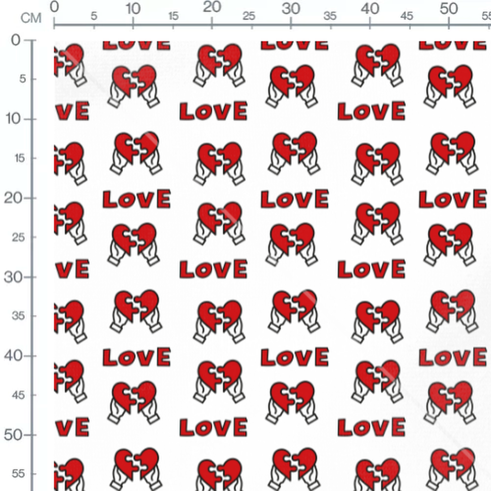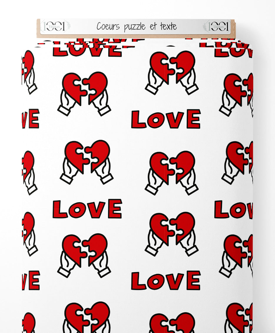 Les cœurs rouges sont divisés en pièces de puzzle et sont tenus par des mains dessinées en noir et blanc. Le mot 'LOVE' est écrit en lettres rouges avec un contour noir.Les tissus