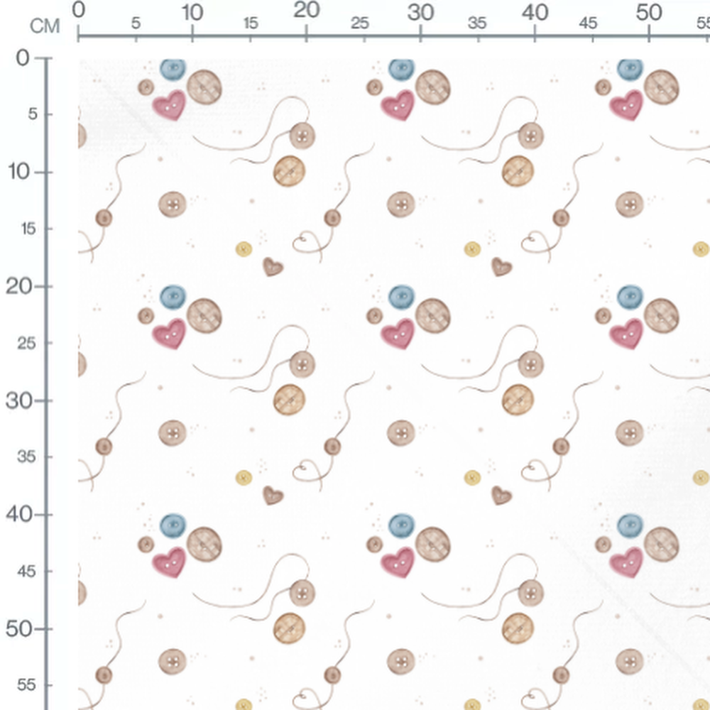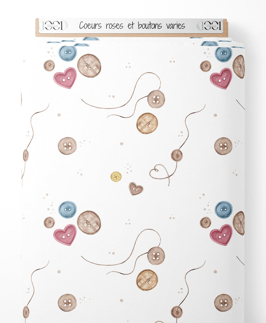 Les boutons sont de différentes tailles et couleurs, incluant des teintes de bleu, jaune, et marron. Des cœurs roses ajoutent une touche de douceur au motif. Des fils marron serpentent entre les boutons, créant un effet dynamique.Les tissus