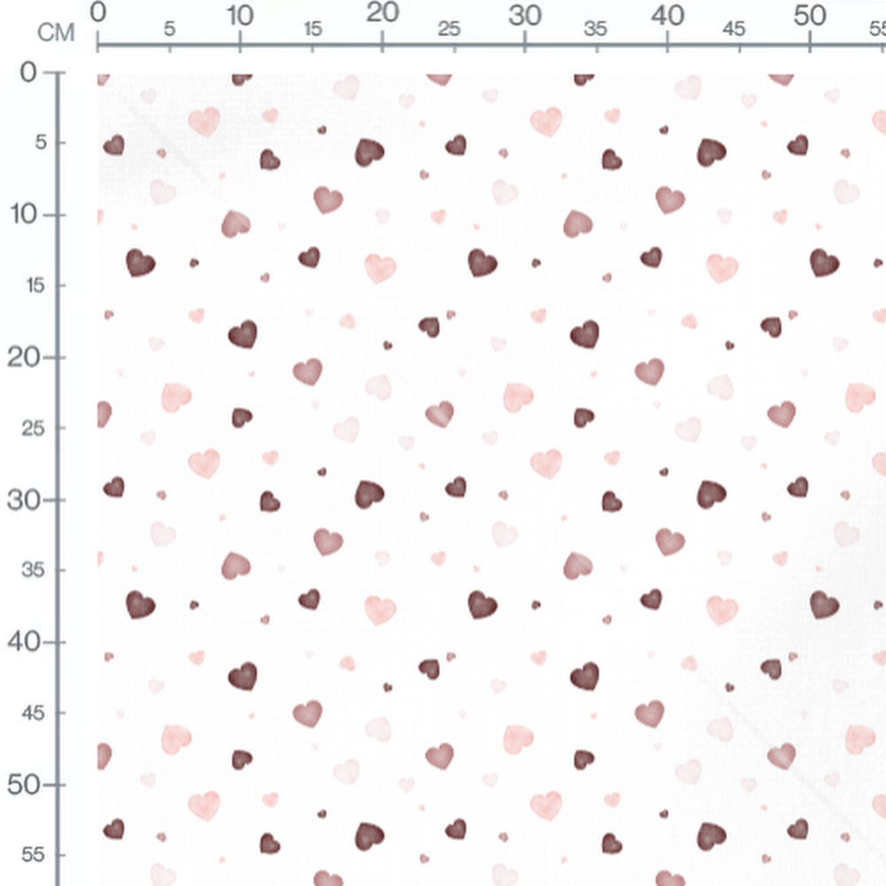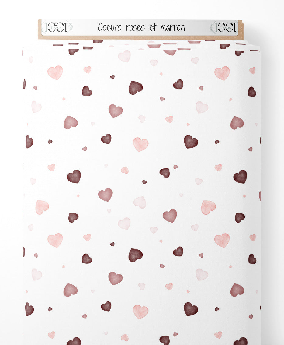 Les cœurs varient en teintes de rose et marron. Le fond blanc met en valeur les couleurs des cœurs.Les tissus