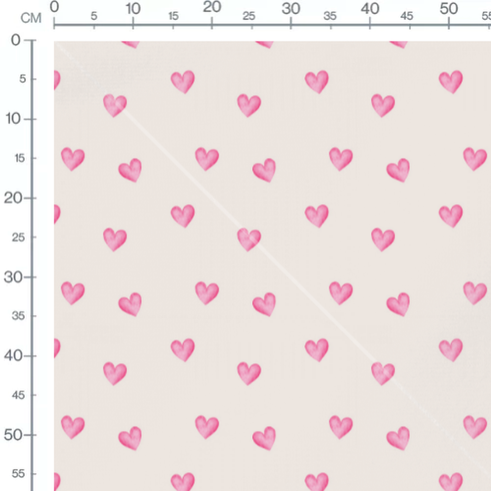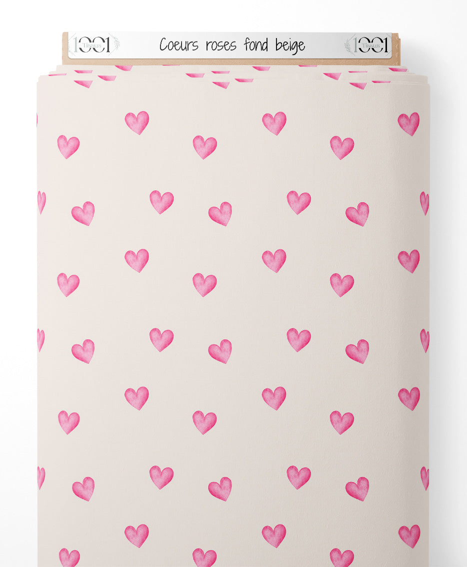 Les cœurs sont de couleur rose vif. Le fond beige met en valeur les motifs de cœurs.Les tissus