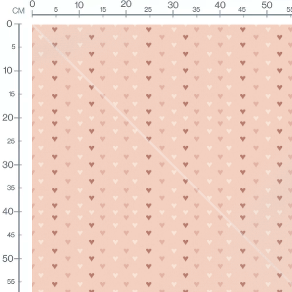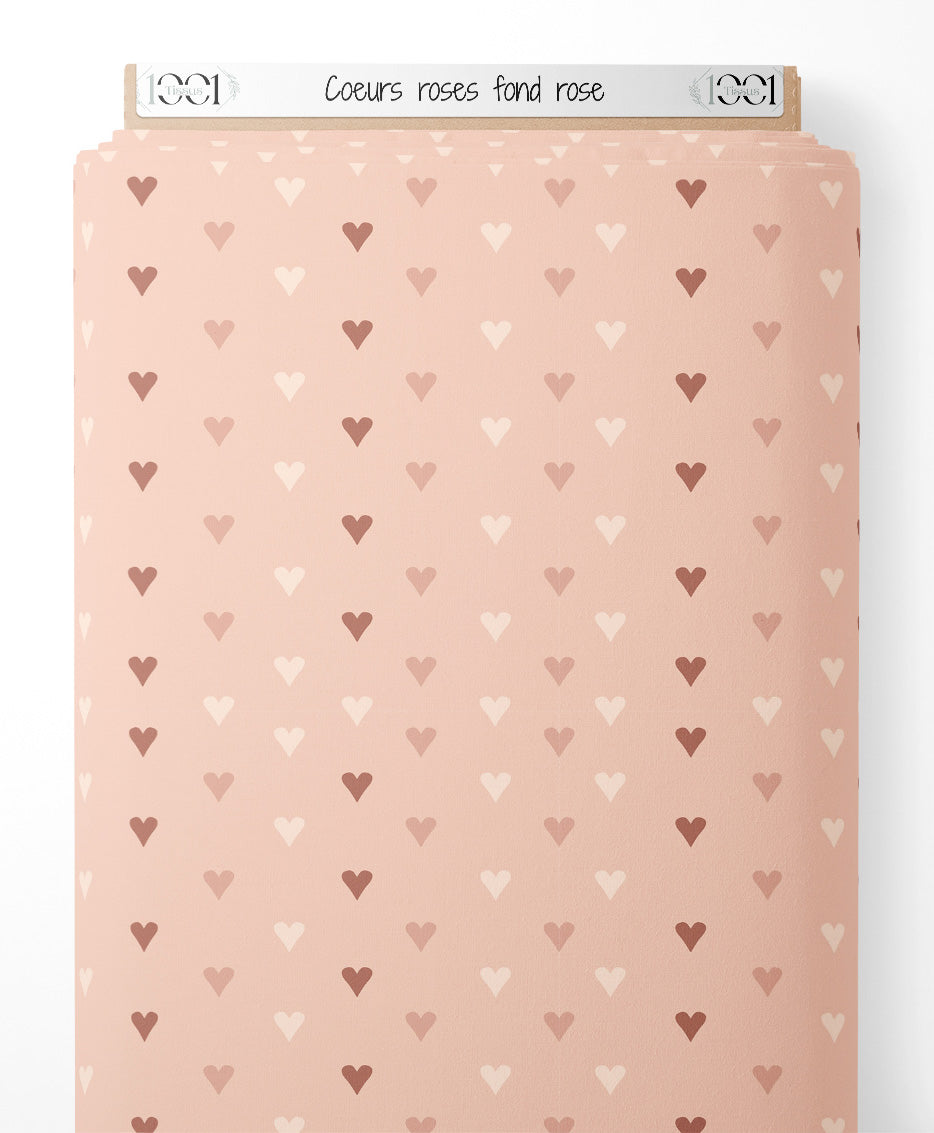 Les cœurs varient du rose pâle au rose foncé. Le fond rose uni met en valeur les motifs de cœurs.Les tissus