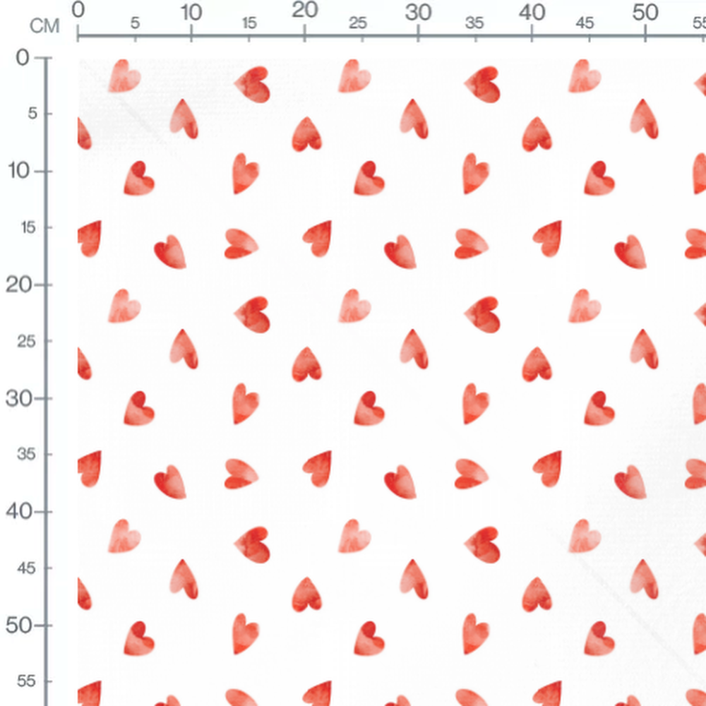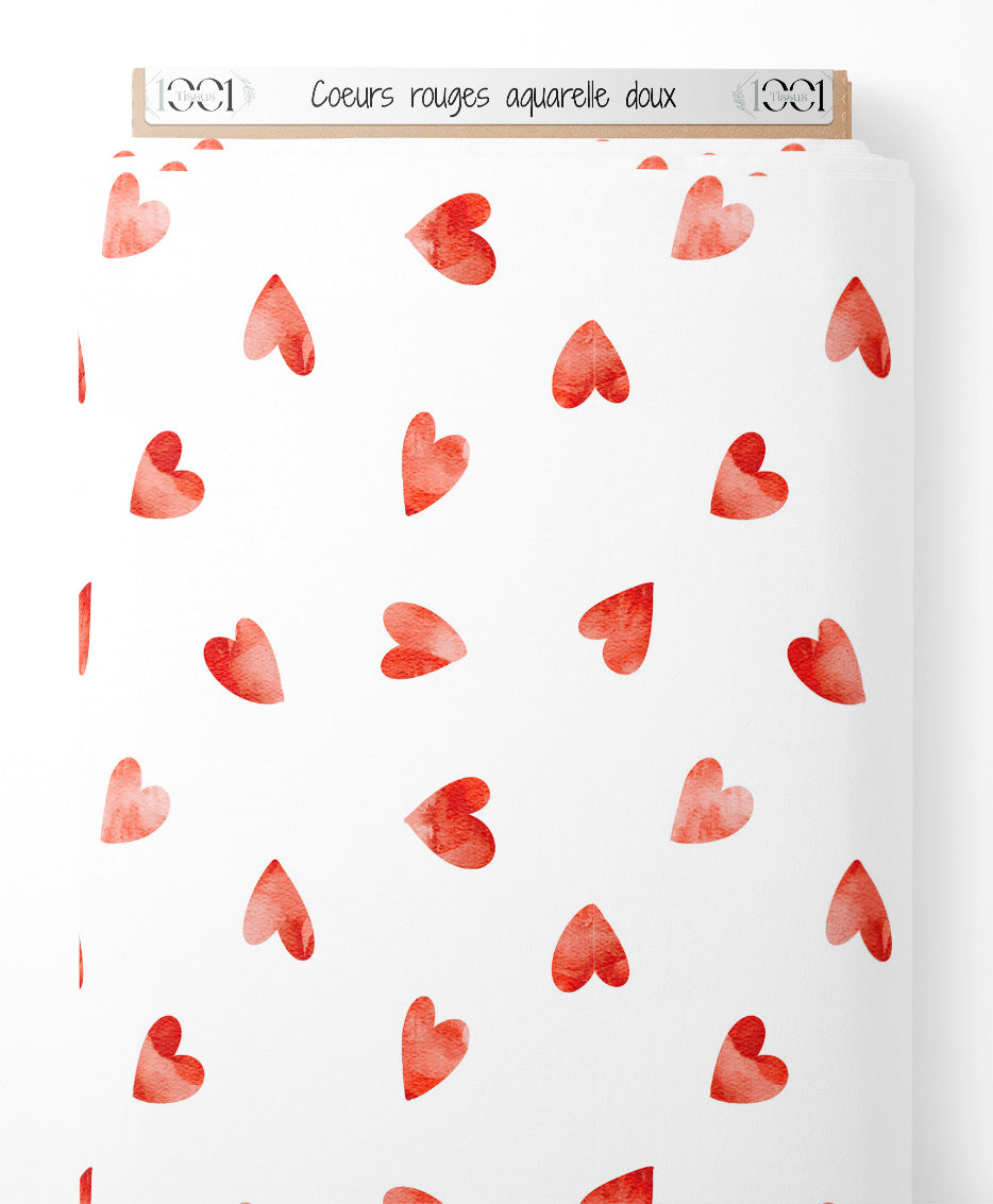 Les cœurs sont de différentes tailles et nuances de rouge. Le style aquarelle donne un effet doux et artistique. Le fond blanc met en valeur les cœurs rouges.Les tissus