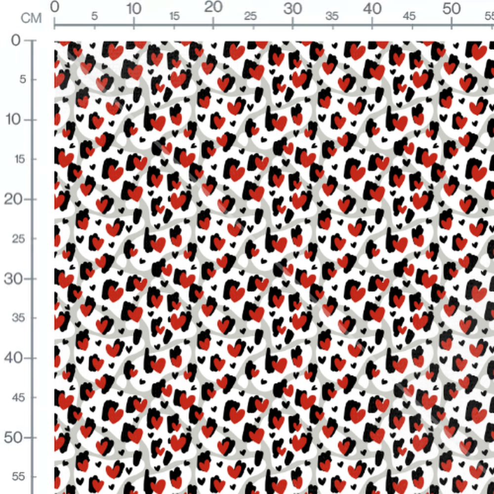 Les cœurs rouges sont de tailles variées. Des formes noires abstraites accompagnent les cœurs.Les tissus