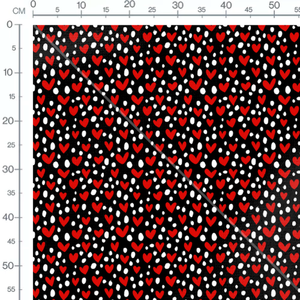 Les cœurs rouges sont dispersés parmi des pois blancs. Le fond noir accentue le contraste des couleurs vives.Les tissus