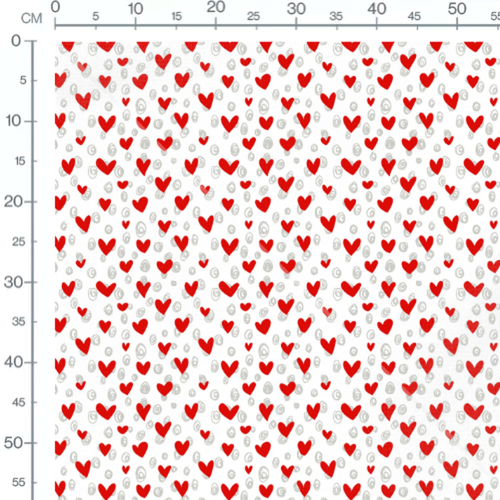 Les cœurs rouges sont de tailles variées. Les spirales grises ajoutent une touche dynamique.Les tissus