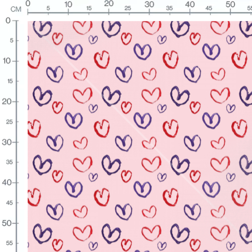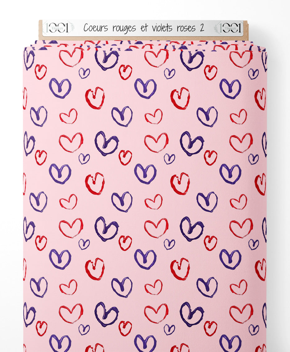 Cœurs rouges et violets sur fond rose. Motif répété de cœurs de différentes tailles.Les tissus