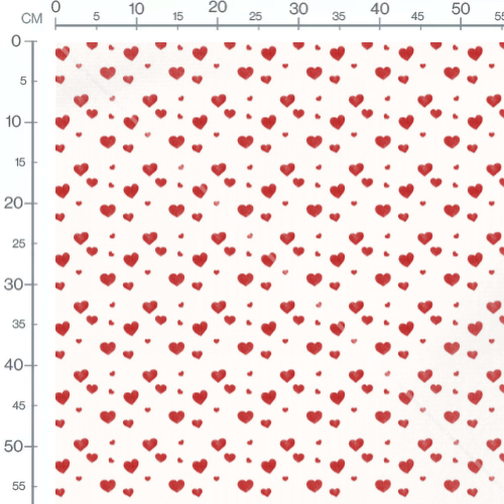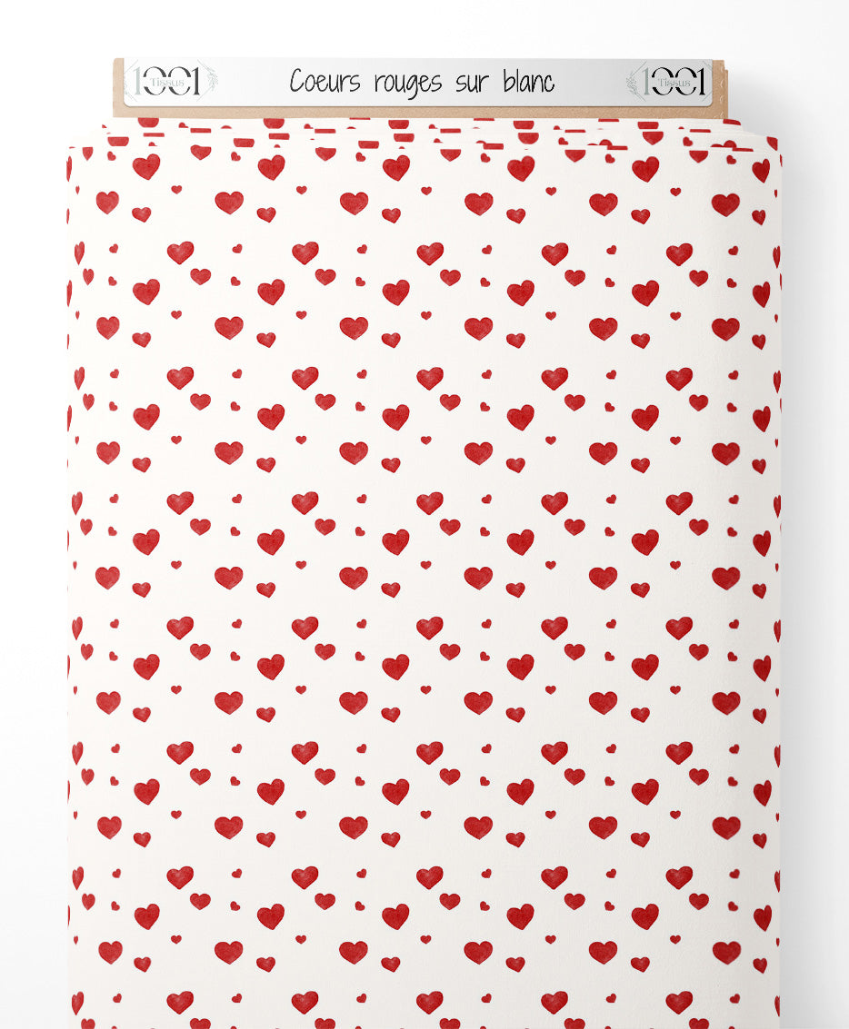 Les cœurs sont dispersés uniformément sur toute la surface. Le fond blanc met en valeur les cœurs rouges.Les tissus