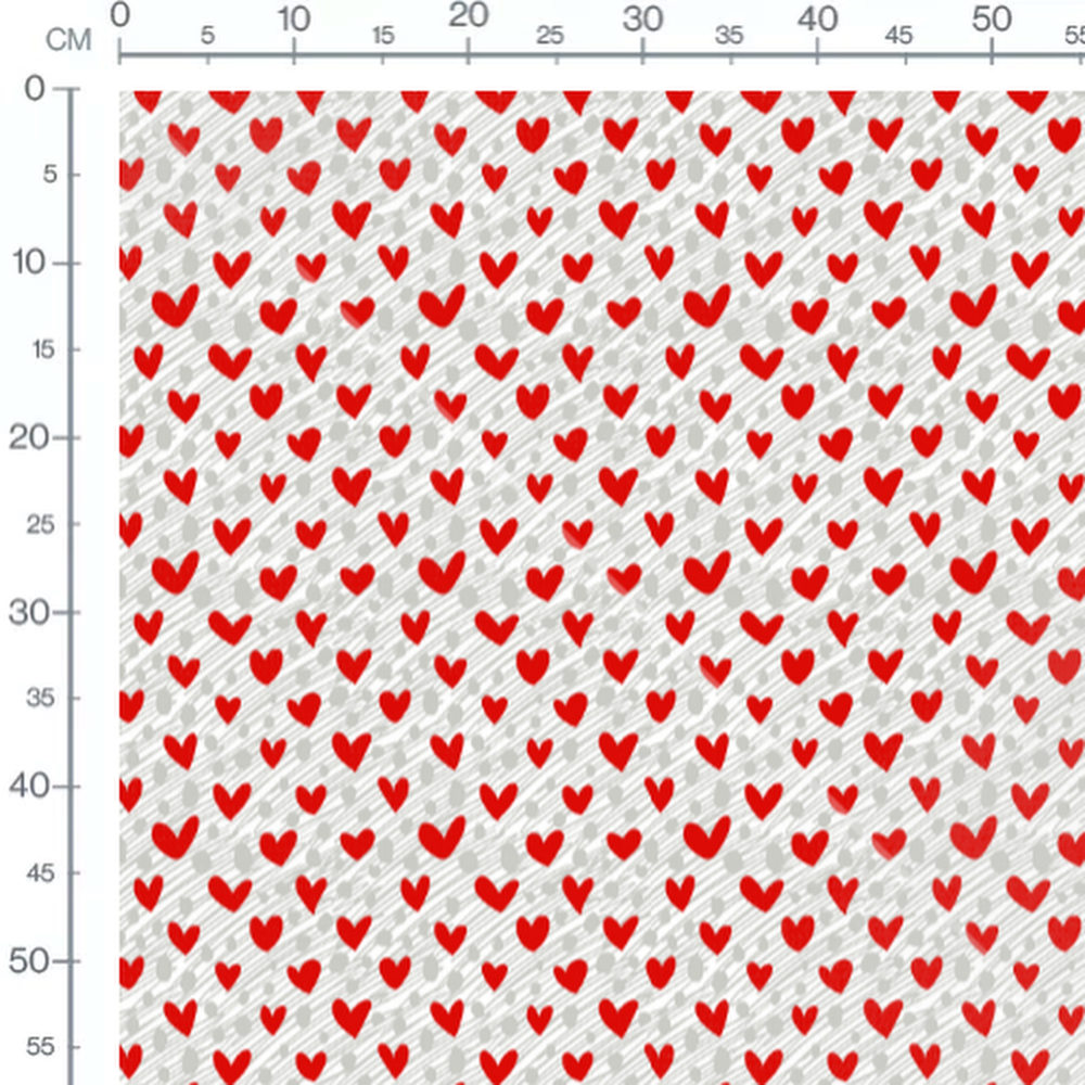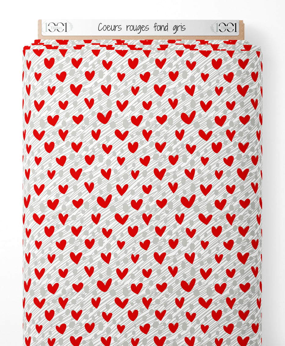 Le fond présente des rayures grises diagonales. Les cœurs rouges sont de tailles variées et dispersés uniformément.Les tissus