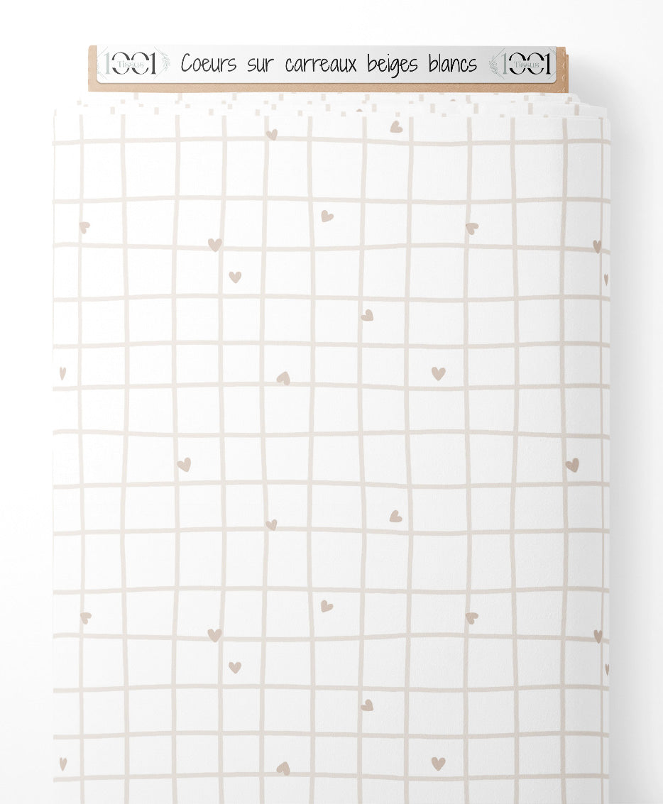 Les carreaux sont réguliers et de couleur beige. Les petits cœurs sont éparpillés de manière aléatoire. Le fond blanc met en valeur les motifs délicats.Les tissus
