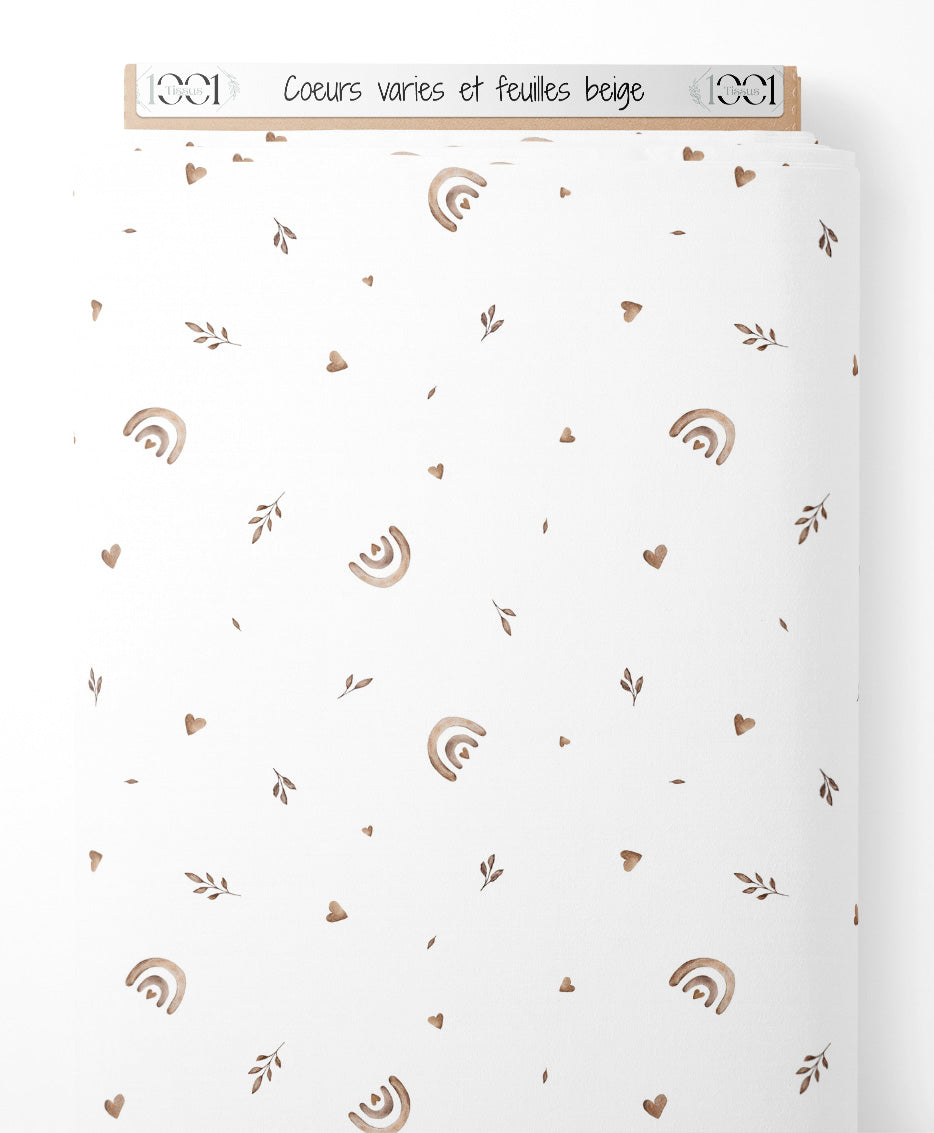 Tissu - Cœurs variés et feuilles beige