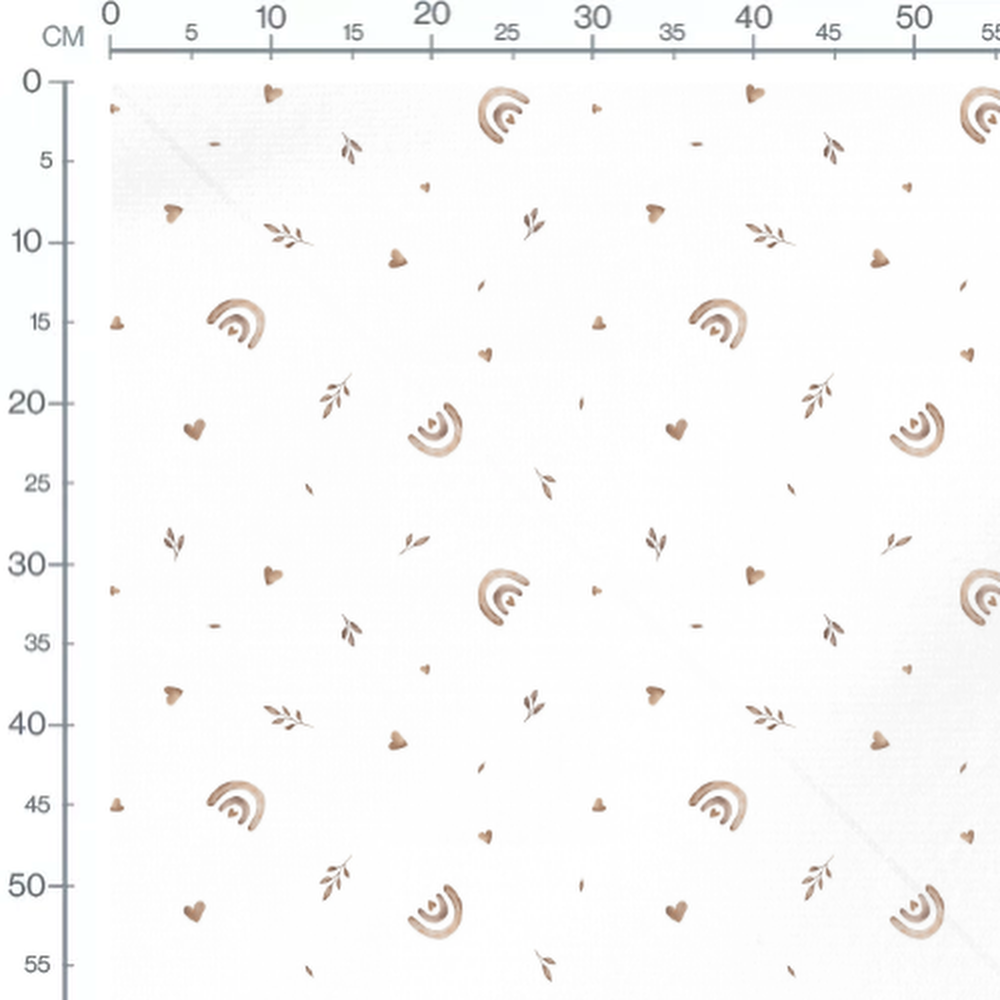 Les cœurs sont de taille variée et de couleur beige. Les arcs sont simples et de teinte beige. Les feuilles sont petites et éparpillées, ajoutant une touche naturelle.Les tissus