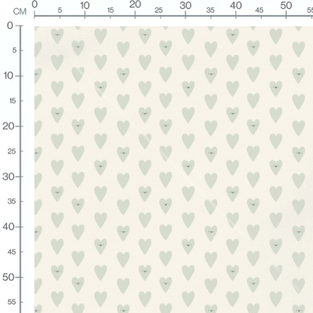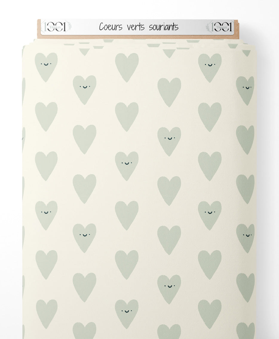 Les cœurs verts avec des visages souriants alternent avec des cœurs verts sans visage. Le fond beige met en valeur la simplicité des motifs.Les tissus