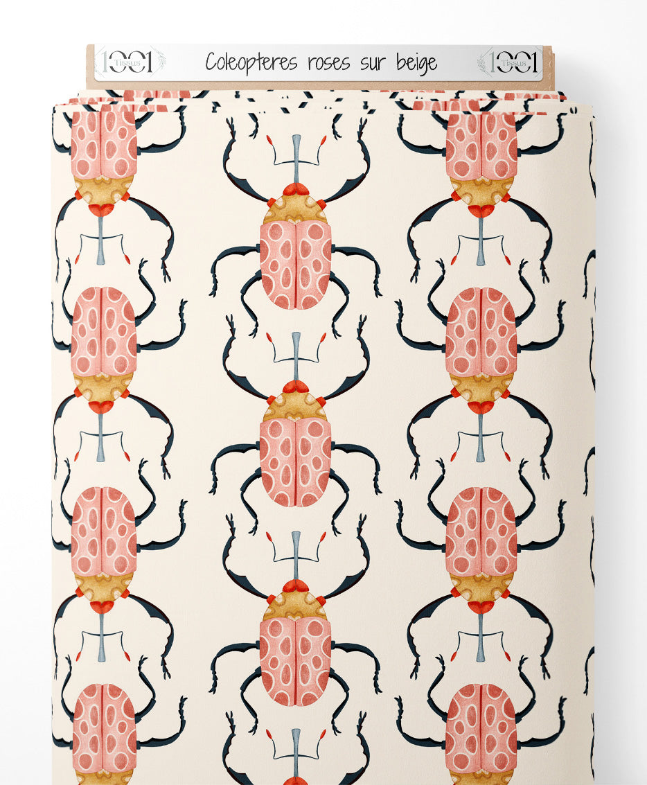 Les coléoptères présentent des motifs ovales blancs sur leur carapace rose. Leurs têtes sont ornées de petites antennes grises et rouges.Les tissus