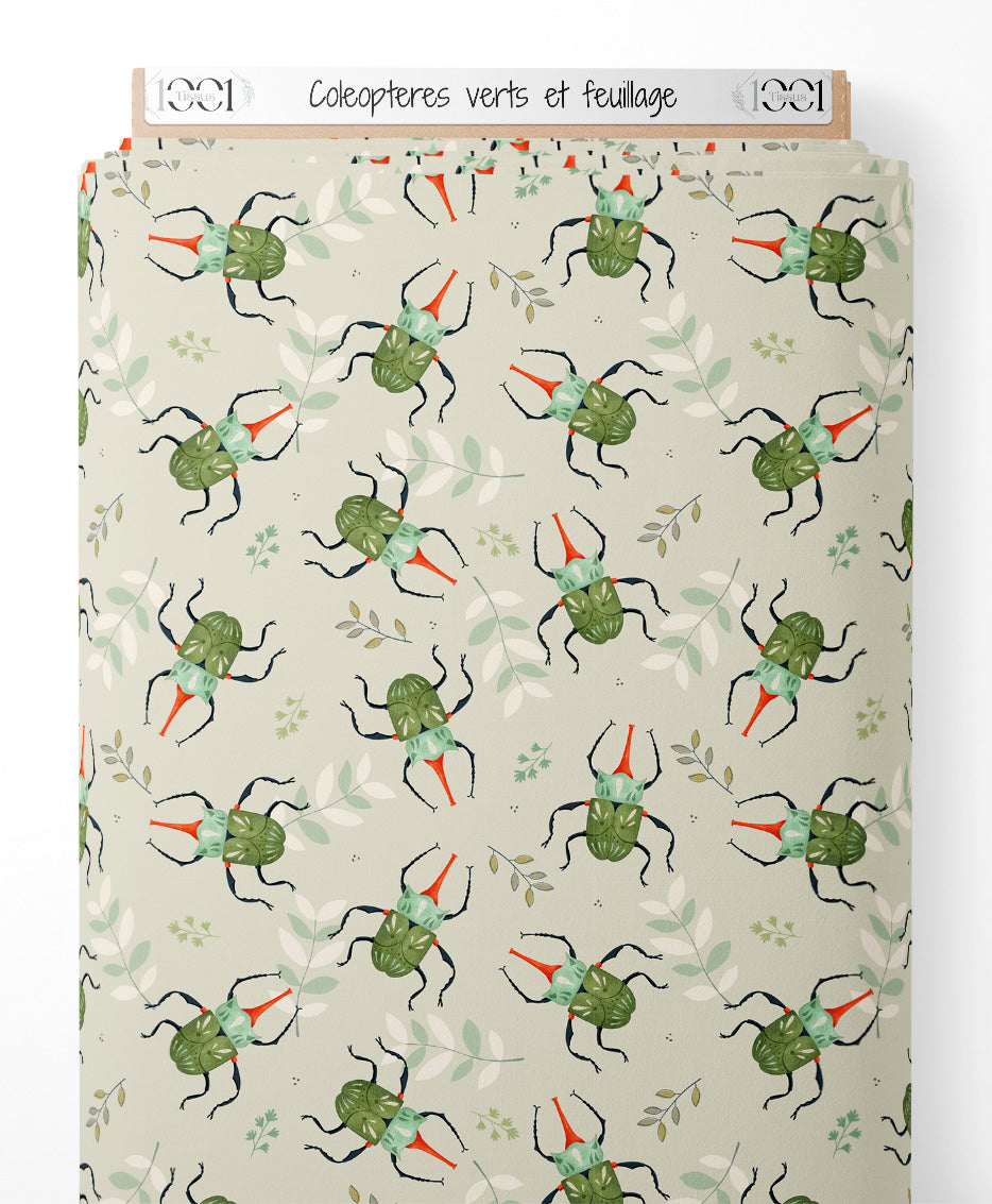 Les coléoptères présentent des détails rouges sur la tête. Les feuilles varient en forme et en teinte, ajoutant de la diversité au motif.Les tissus