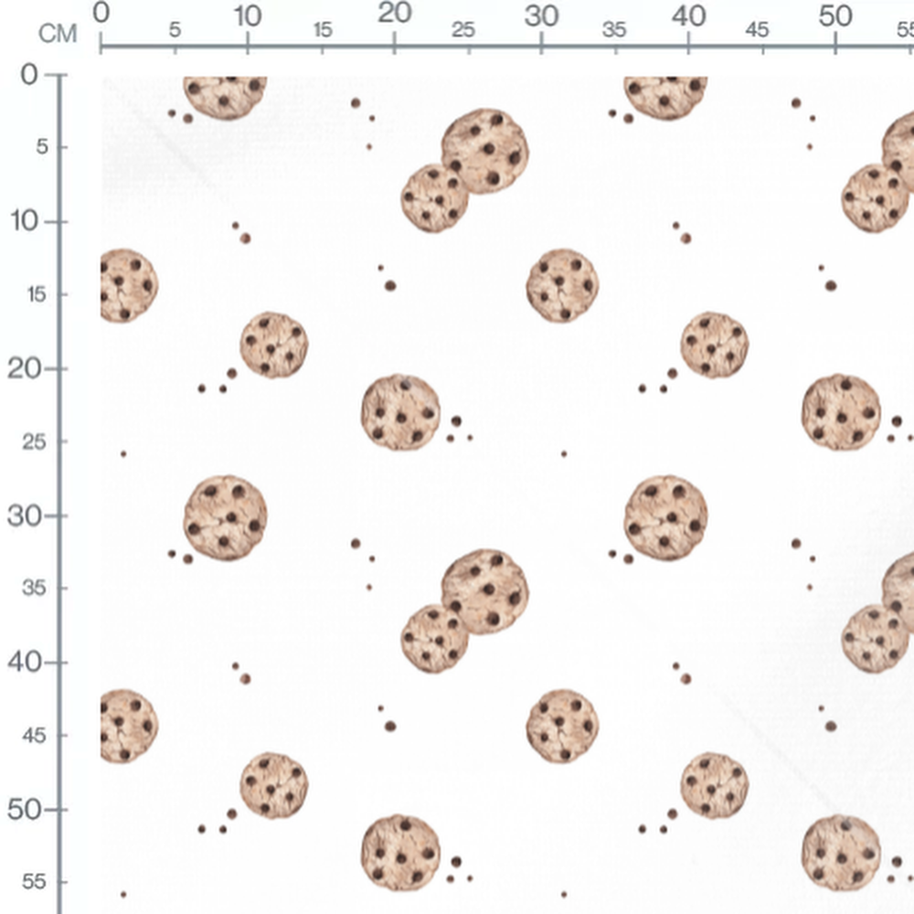 Les cookies sont de couleur beige avec des pépites de chocolat foncées. Le fond blanc met en valeur les détails des cookies et des pépites.Les tissus