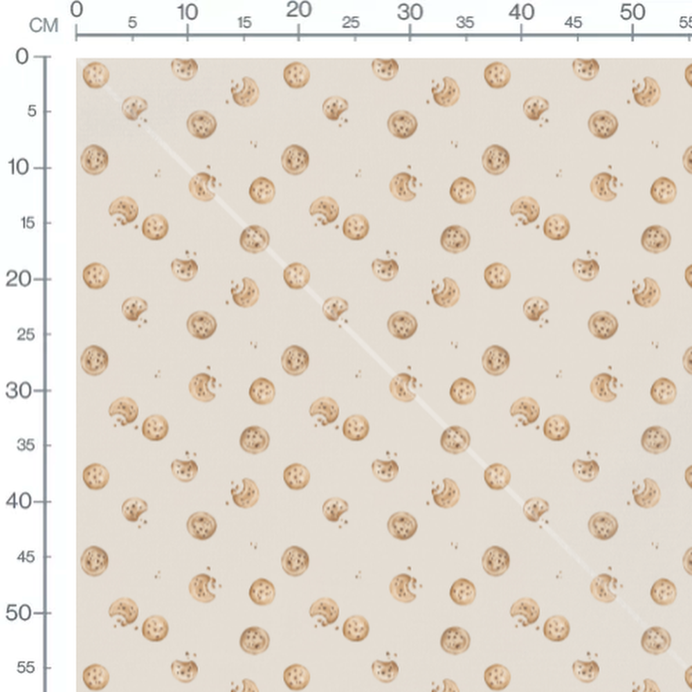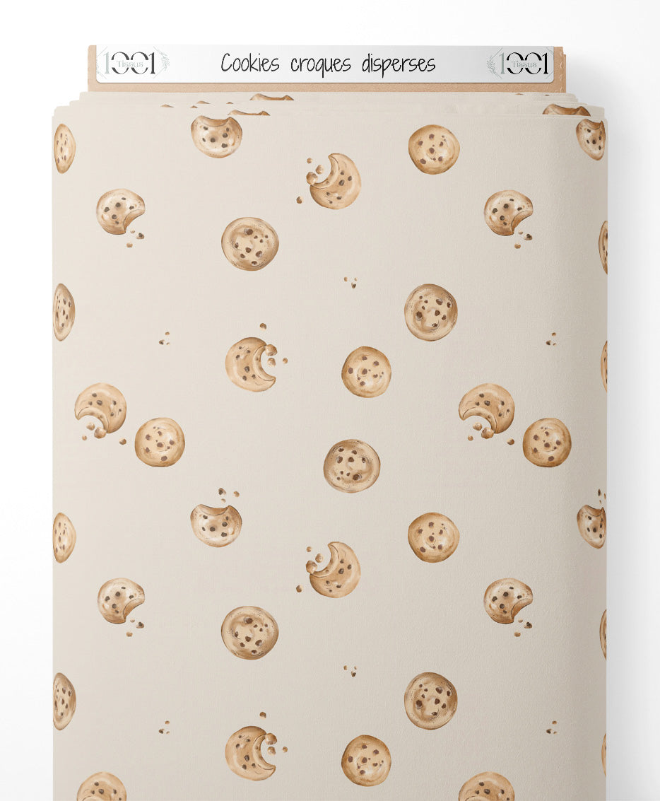 Les cookies sont de différentes tailles et certains sont partiellement croqués. Les miettes ajoutent un effet réaliste au motif.Les tissus