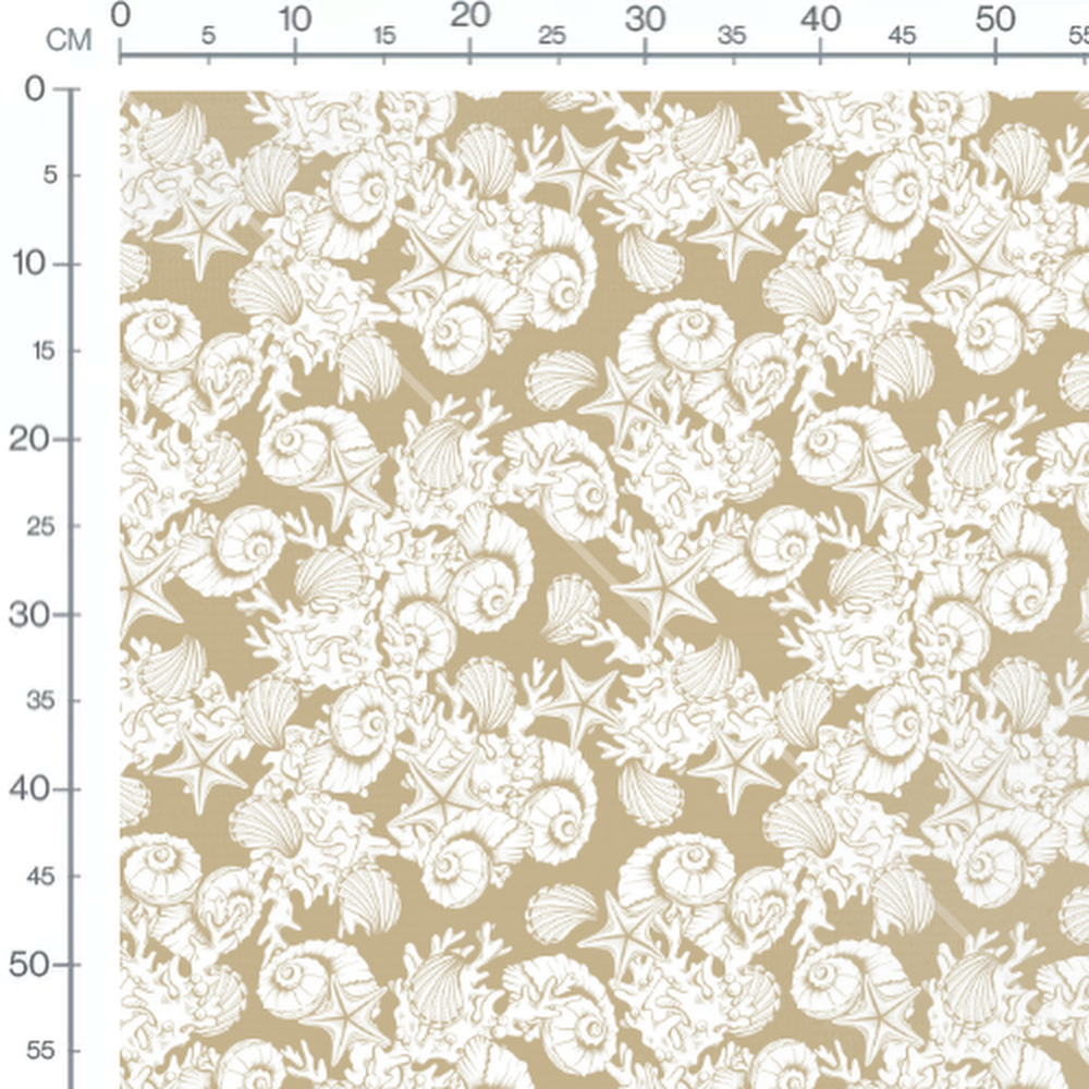 Les coquillages présentent des détails fins et variés. Les étoiles de mer sont dispersées parmi les coraux. Le fond beige met en valeur les motifs marins blancs.Les tissus