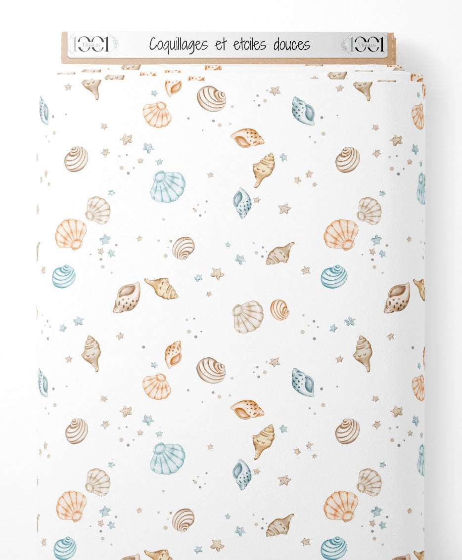 Les coquillages présentent des motifs rayés et tachetés. Les étoiles de mer sont entourées de petits points gris. Les couleurs douces créent une ambiance marine apaisante.Les tissus