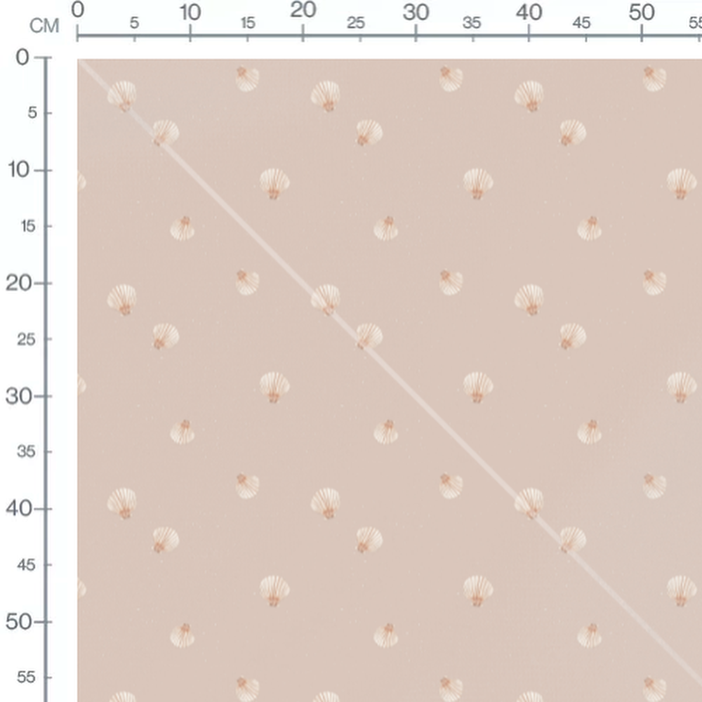 Les coquillages sont de couleur blanche avec des nuances de beige. Le fond beige est parsemé de petites taches blanches, ajoutant une texture subtile.Les tissus