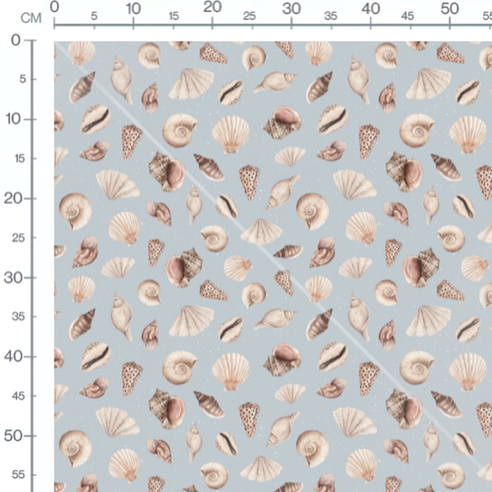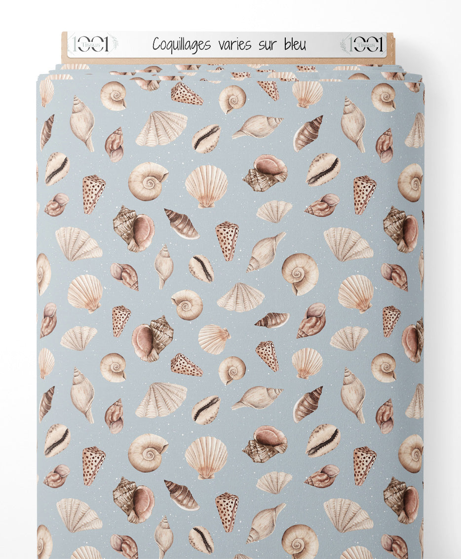 Les coquillages incluent des spirales et des formes coniques. Le fond bleu est parsemé de petits points blancs. Les coquillages présentent des nuances de beige et de brun.Les tissus