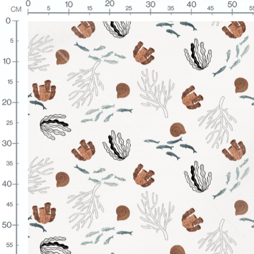 Les poissons sont de différentes nuances de bleu et gris. Les coraux sont dessinés avec des lignes fines et variées. Les coquillages ajoutent une touche naturelle au motif marin.Les tissus