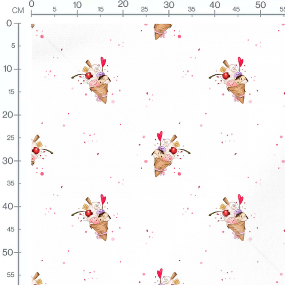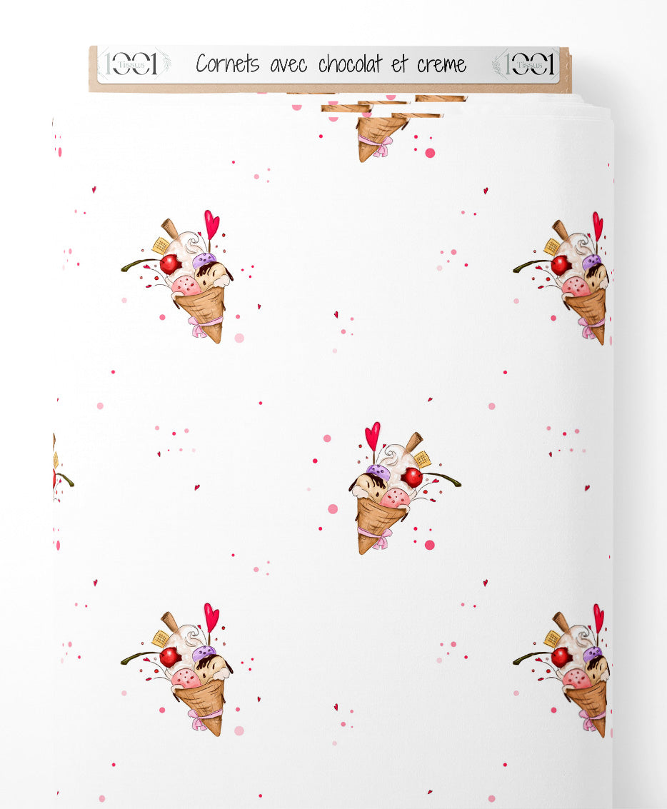 Les cornets de glace sont ornés de cerises rouges et de cœurs roses. Des touches de crème fouettée et de chocolat ajoutent de la variété. Le fond blanc est parsemé de petits points roses et rouges.Les tissus