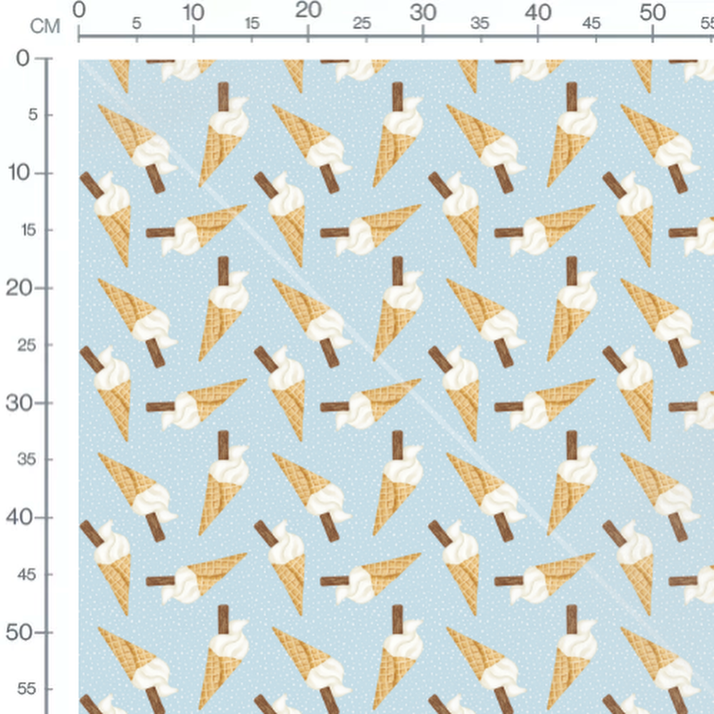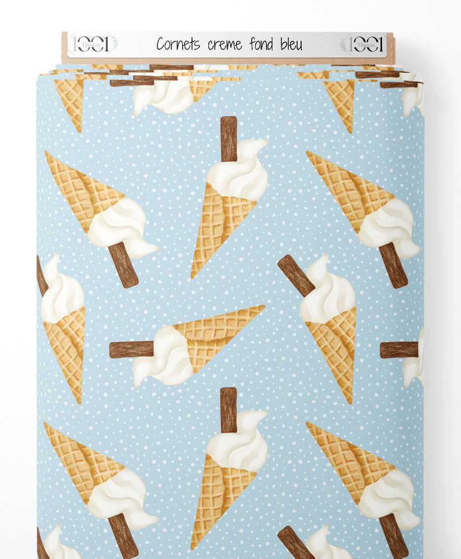 Les cornets de glace sont disposés de manière aléatoire sur le fond. Le motif présente une répétition de cornets avec une texture de gaufrette. Les pois blancs ajoutent une touche ludique au fond bleu.Les tissus