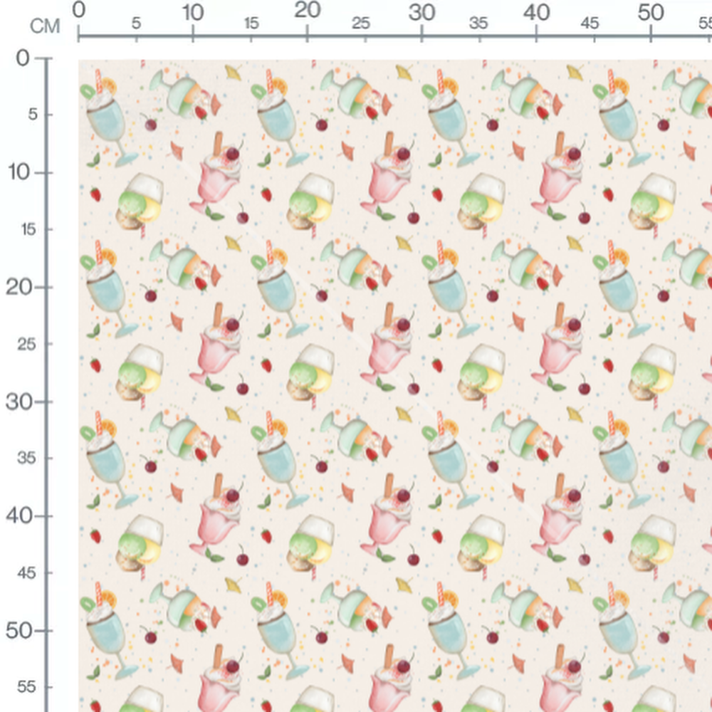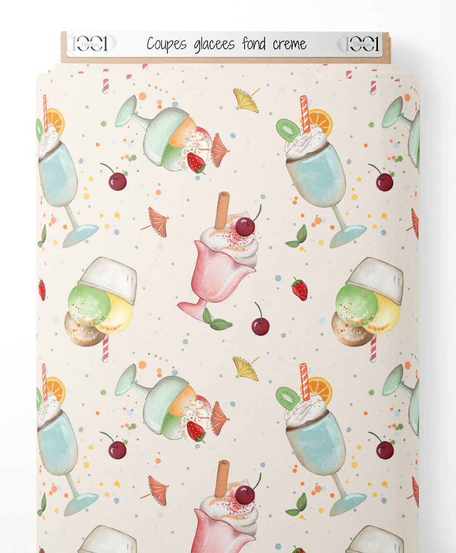 Les coupes glacées sont garnies de fruits comme des cerises et des fraises. Des parapluies en papier ajoutent une touche festive. Des points colorés parsèment le fond crème.Les tissus