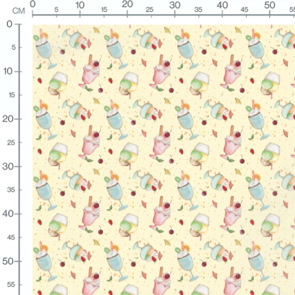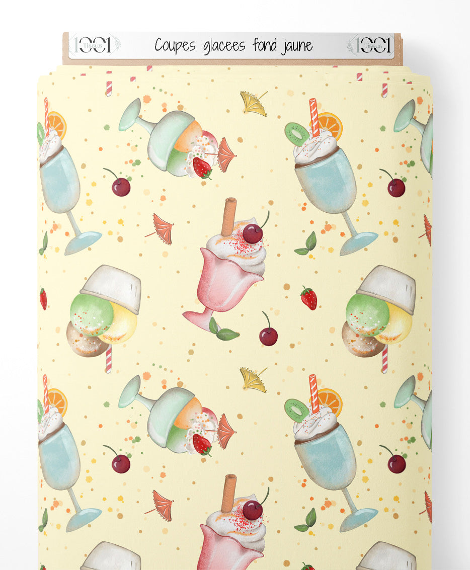 Les coupes glacées sont ornées de tranches de kiwi et d'orange. Des parasols colorés et des cerises ajoutent une touche festive. Des points multicolores parsèment le fond jaune.Les tissus