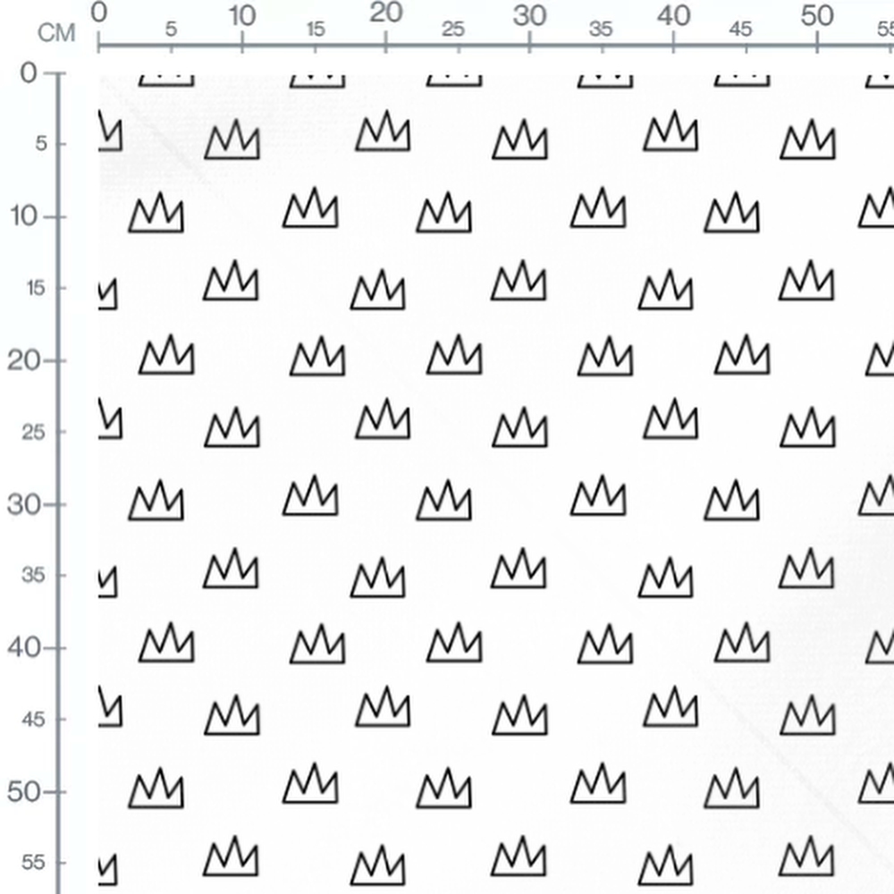 Les couronnes sont dessinées avec des lignes noires épaisses. Le fond blanc met en valeur le motif géométrique.Les tissus