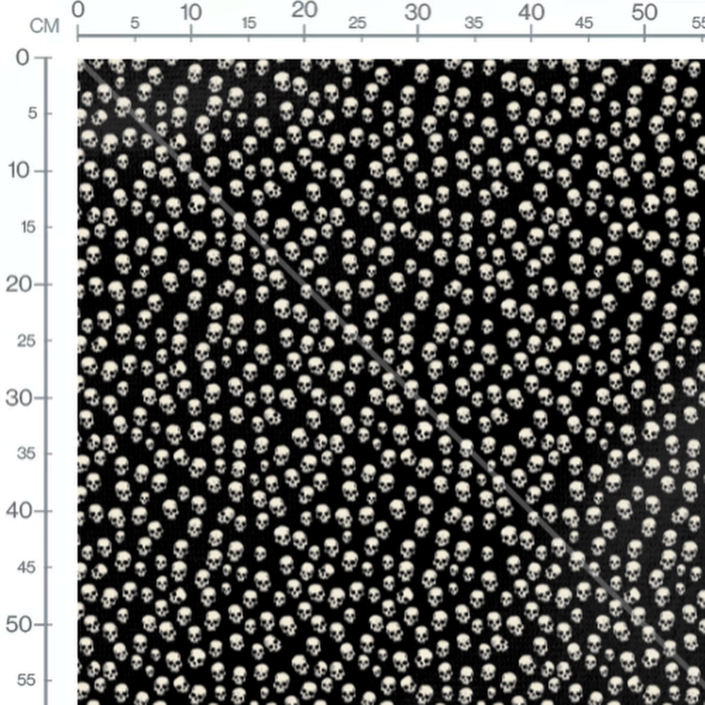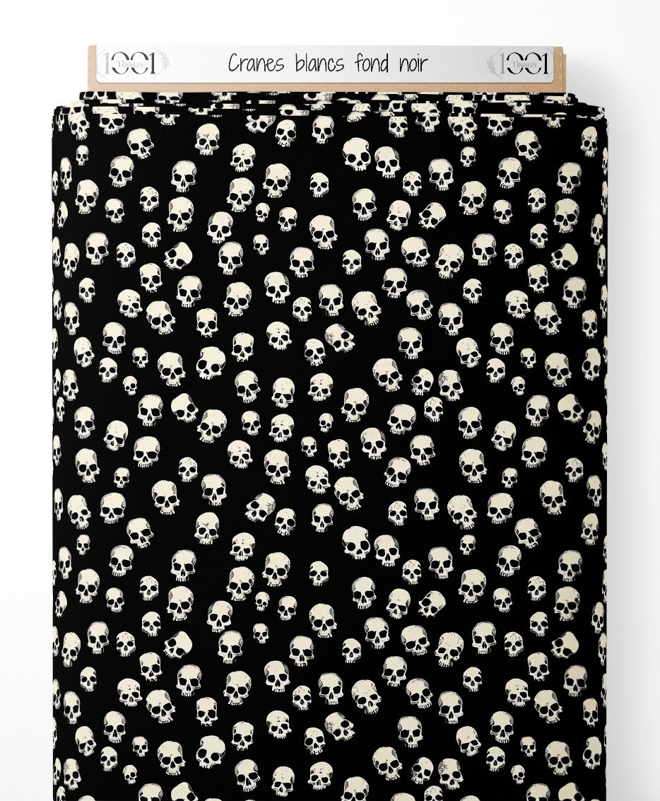 Les crânes sont de tailles variées et uniformément répartis. Chaque crâne présente des détails distincts, ajoutant de la complexité au motif. Le fond noir accentue le contraste avec les crânes blancs.Les tissus