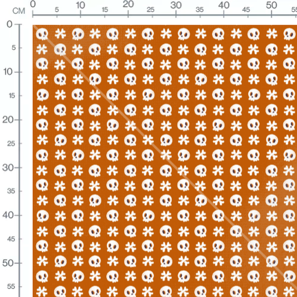 Les crânes sont uniformément répartis et accompagnés d'os croisés. Le fond orange vif contraste avec les motifs blancs.Les tissus
