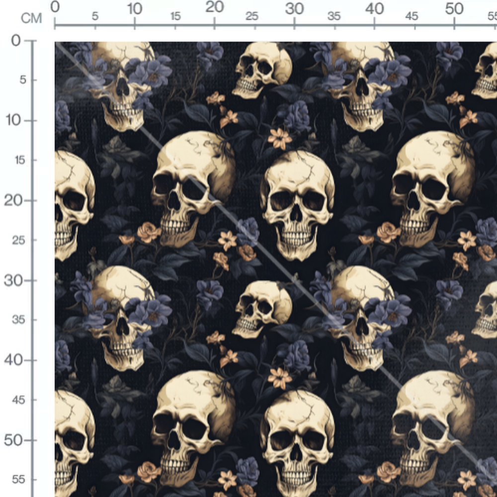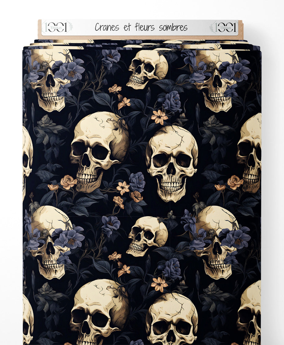 Les crânes sont détaillés avec des fissures visibles. Les fleurs violettes et roses ajoutent une touche de couleur au motif. Le fond noir accentue le contraste avec les éléments clairs et colorés.Les tissus