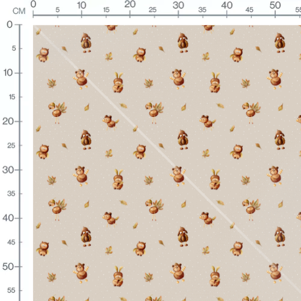 Les animaux sont accompagnés de feuilles aux teintes automnales. Les motifs incluent des chouettes, des ours et d'autres créatures imaginaires. Le fond beige est parsemé de petits pois blancs.Les tissus
