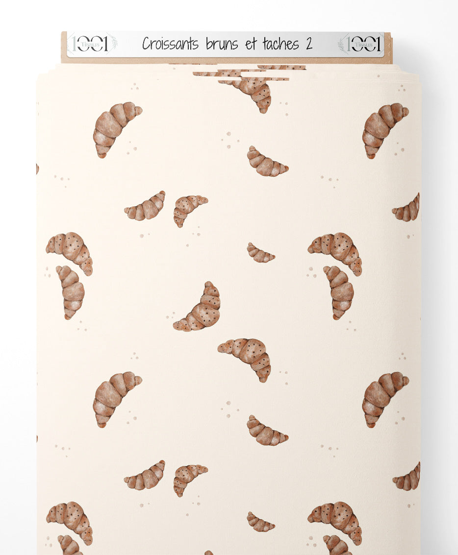 Les croissants sont de différentes tailles et nuances de brun. Le fond crème est parsemé de petites taches brunes, ajoutant un effet texturé.Les tissus