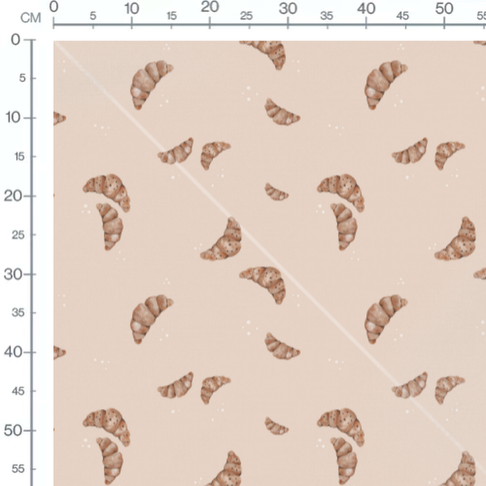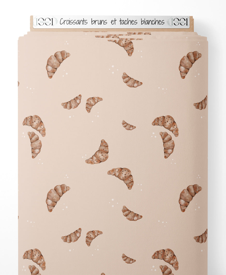 Les croissants sont de différentes tailles et nuances de brun. Le fond beige est parsemé de petites taches blanches, ajoutant un effet de texture.Les tissus