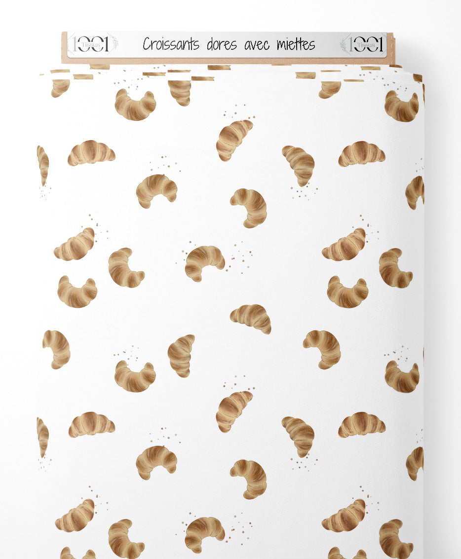 Croissants dorés sur fond blanc. Petites miettes dispersées autour des croissants.Les tissus