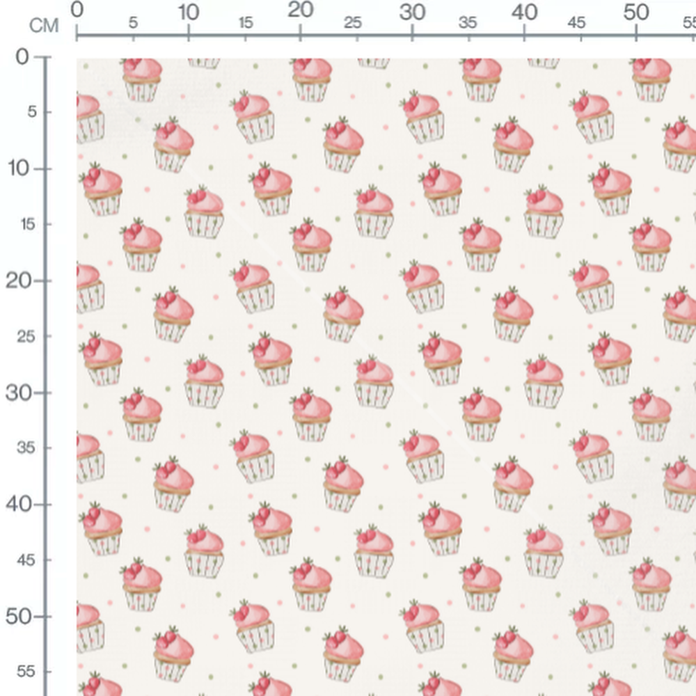 Les cupcakes ont un glaçage rose et sont décorés de fraises. Le fond crème est parsemé de petits pois verts et roses. Les caissettes des cupcakes sont blanches avec des rayures et pois verts.Les tissus