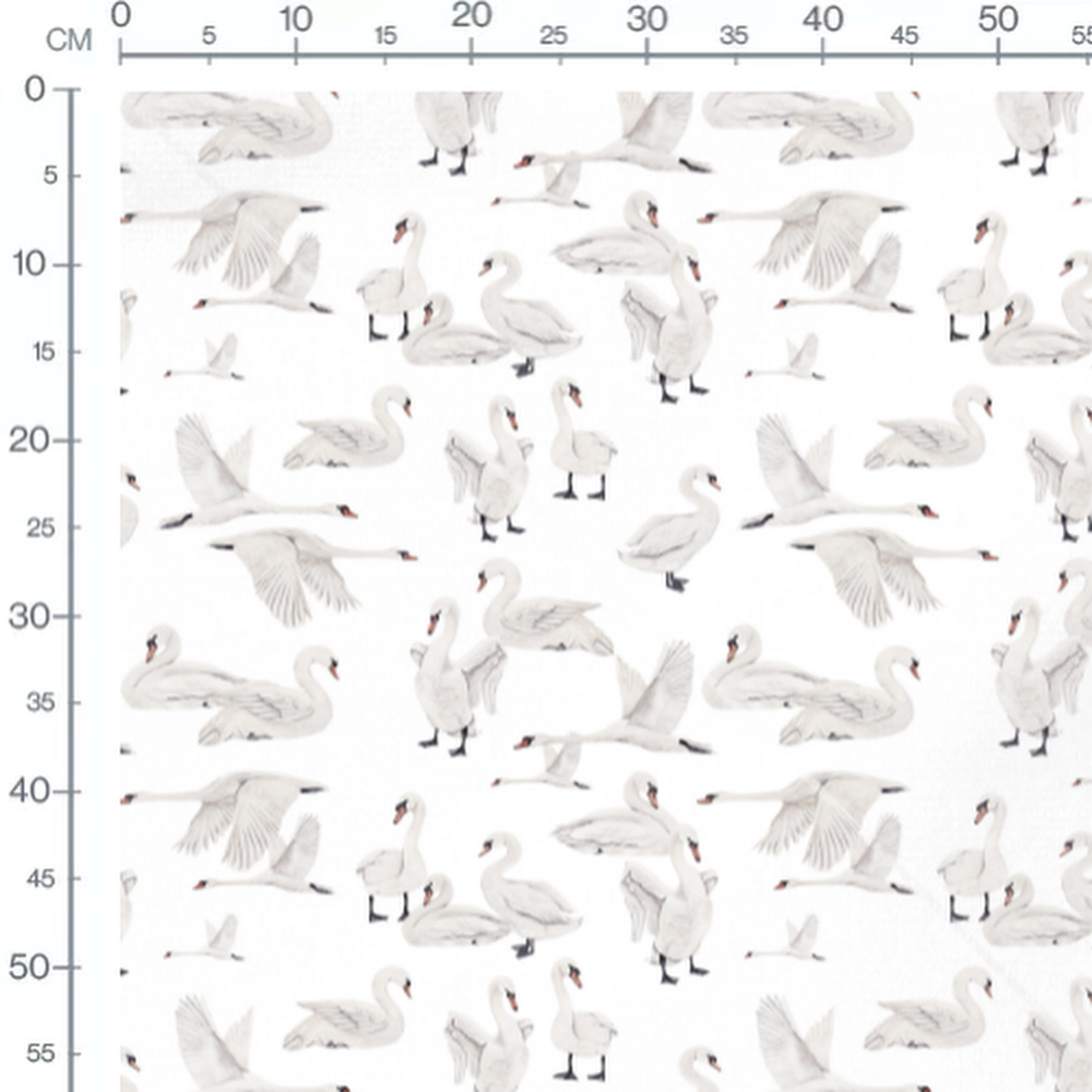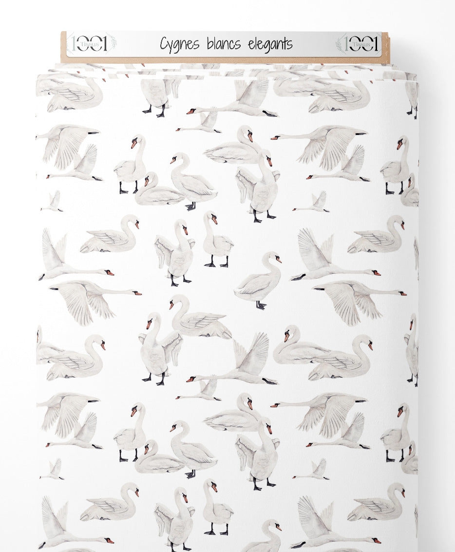 Les cygnes sont représentés avec des plumes détaillées et des becs orange vif. Le motif montre des cygnes en vol avec des ailes déployées et d'autres posés calmement. Les nuances de blanc et de gris ajoutent de la profondeur aux plumes des cygnes.Les tissus