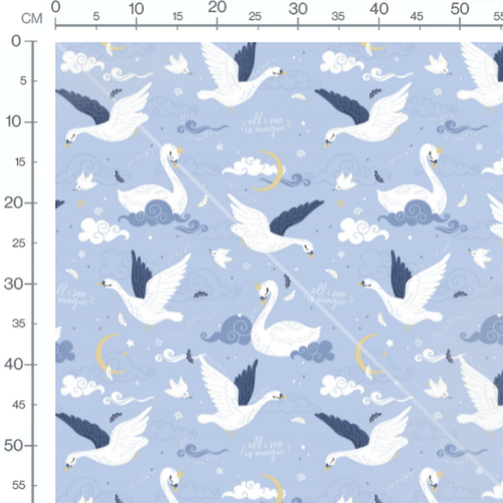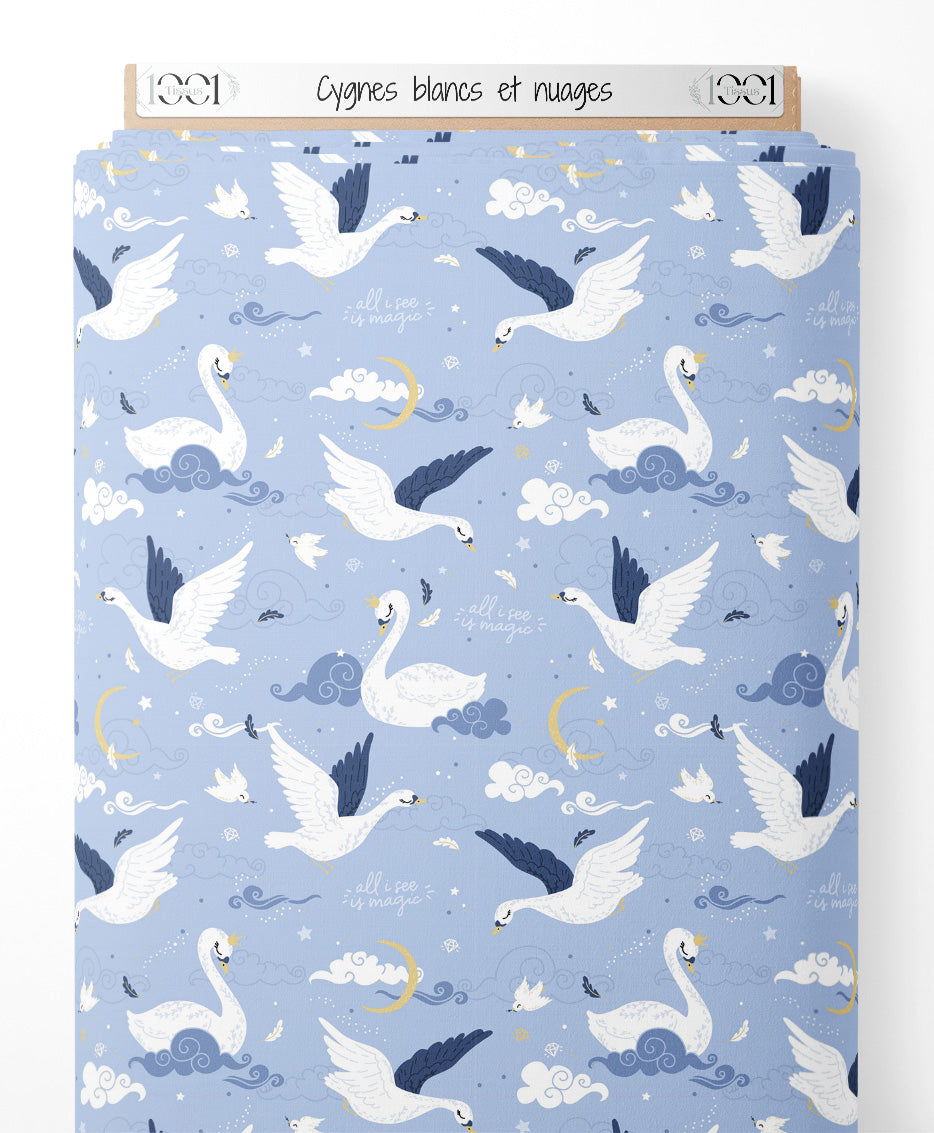 Petits oiseaux blancs et motifs de nuages complètent le design. Éléments célestes comme la lune et des étoiles ajoutent une touche magique. Quelques plumes et inscriptions décoratives sont présentes.Les tissus