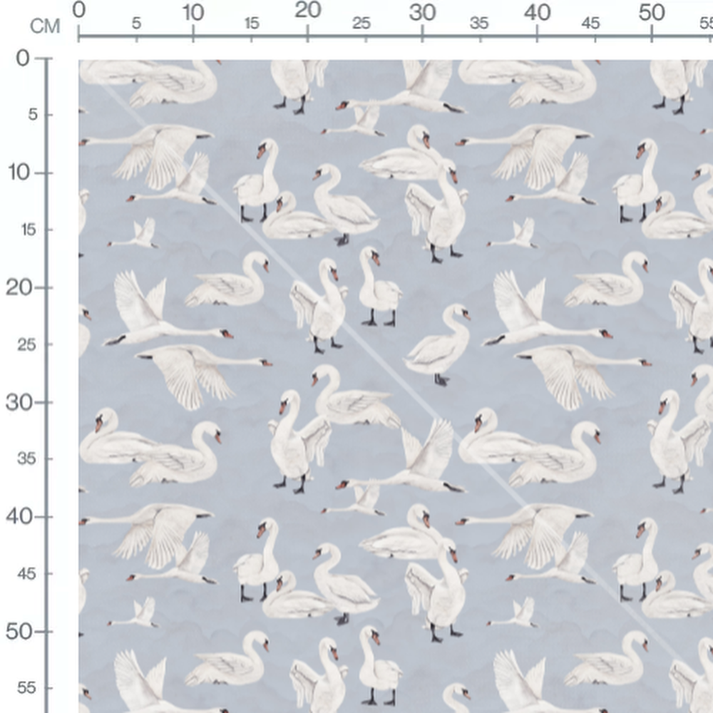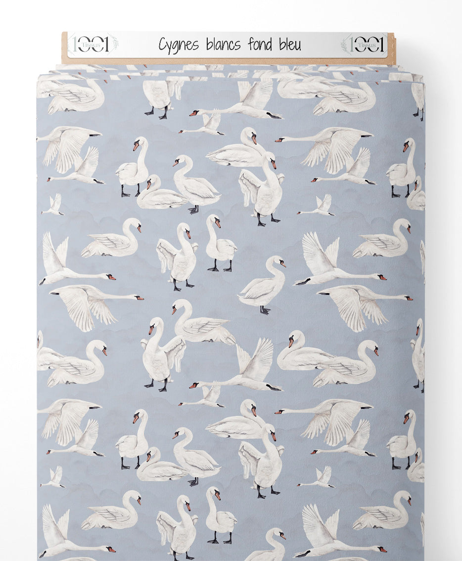 Les cygnes sont représentés en vol et au repos. Le fond bleu clair évoque un ciel paisible. Les détails des plumes et des becs ajoutent du réalisme.Les tissus