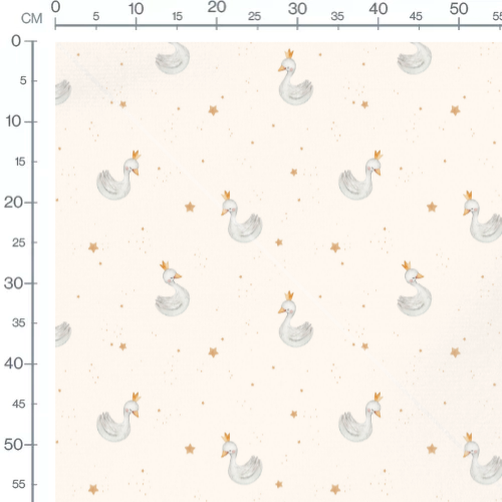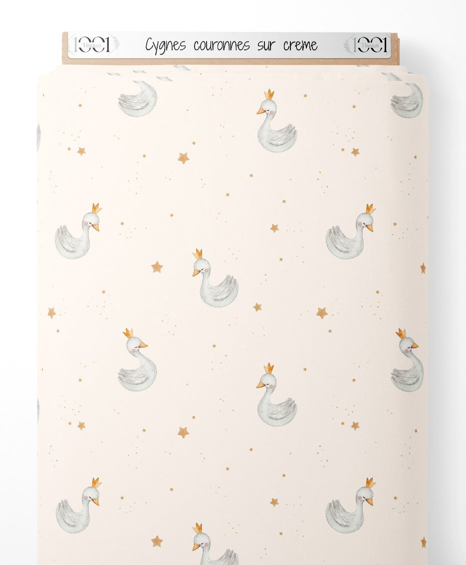 Les cygnes portent de petites couronnes dorées, ajoutant une touche royale. Les étoiles dorées sont de tailles variées et parsèment le fond crème. Quelques points dorés complètent le motif délicat.Les tissus