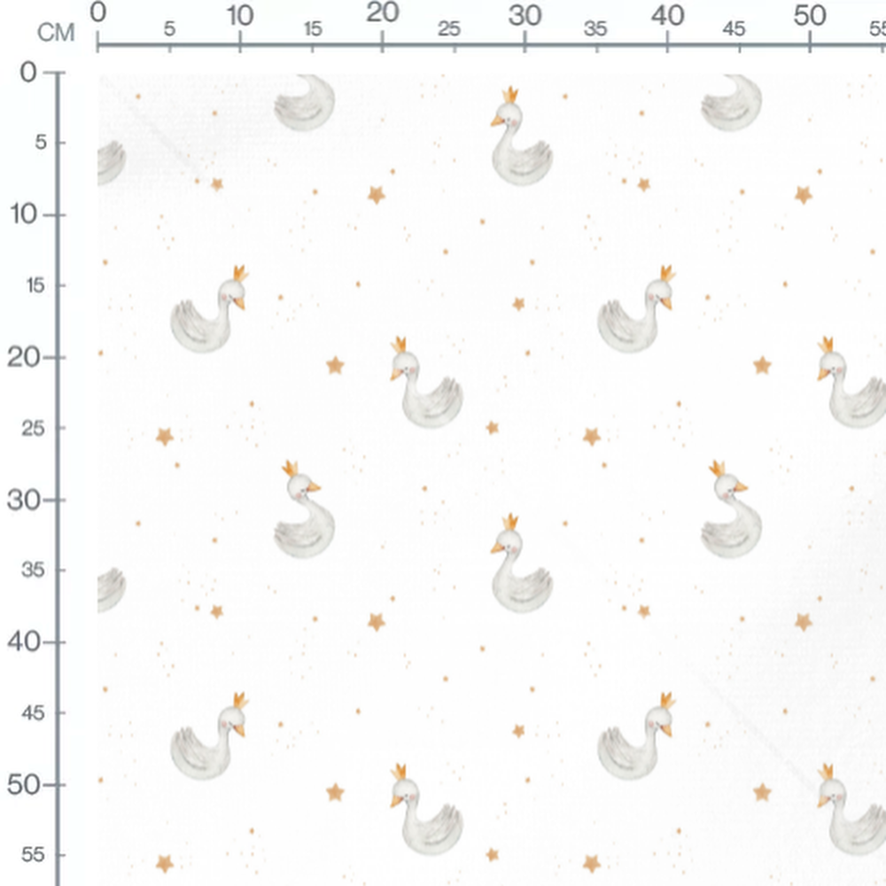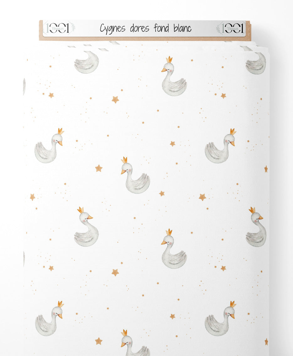 Les cygnes sont délicatement dessinés avec des couronnes dorées. De petites étoiles dorées ajoutent une touche de magie au motif.Les tissus